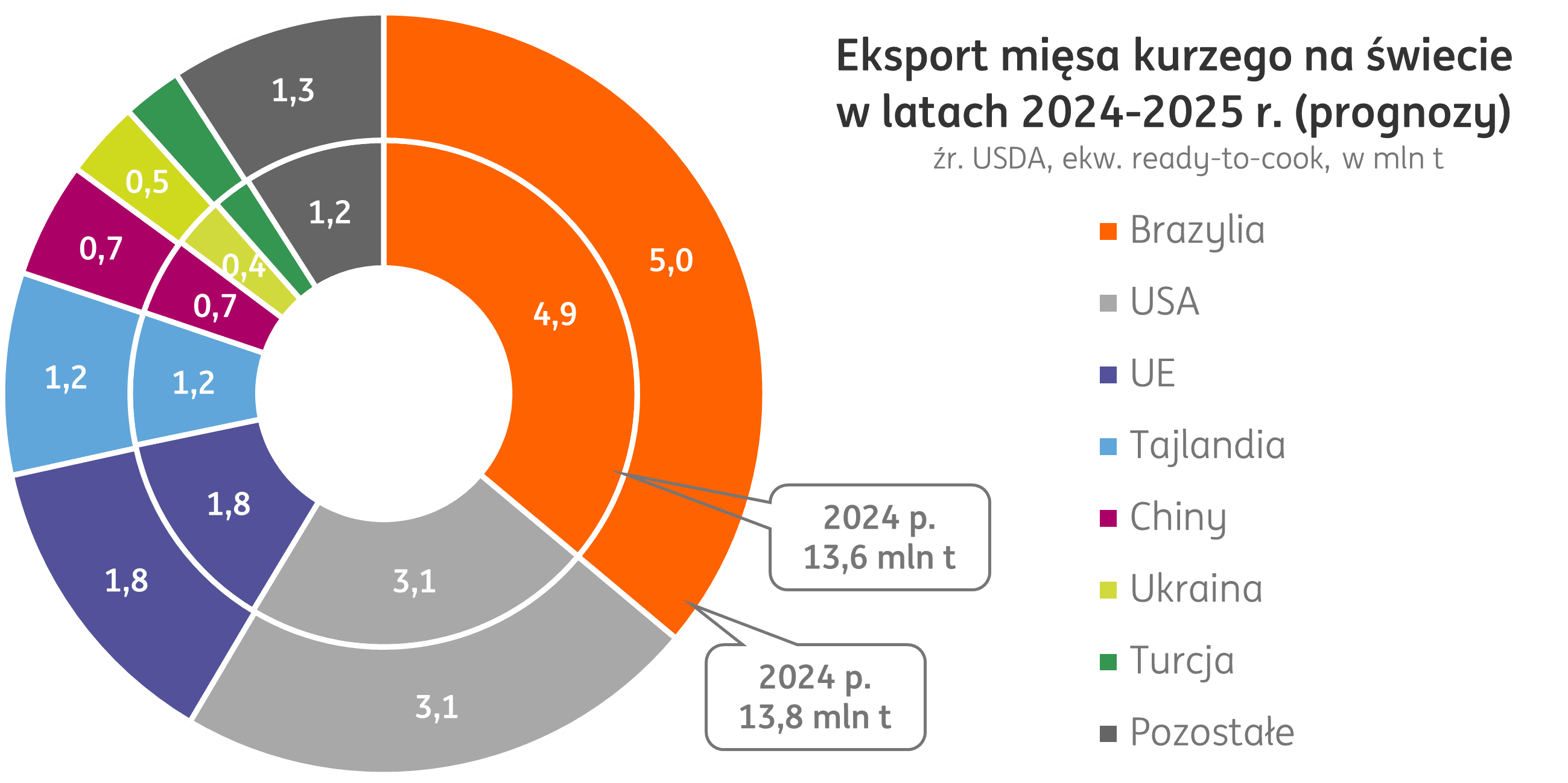 Świat. Globalny handel mięsem kurzym ma w 2025 r. osiągnąć wolumen 13,8 mln t (prognozy USDA), to wzrost o 0,3 mln t w relacji rocznej. 36% eksportowanego mięsa kurzego pochodzić ma z Brazylii, której eksport jest prognozowany na poziomie 5,0 mln t (+2,0% r/r). Odbiorcy są bardziej rozproszeni, największym z nich jest Japonia, importująca 1,1 mln t (+0,9% r/r) tego produktu rocznie, kolejny jest Meksyk z importem 1,0 mln t (+2,1% r/r) oraz Wielka Brytania z wolumenem 1,0 mln t (+1,6 % r/r).