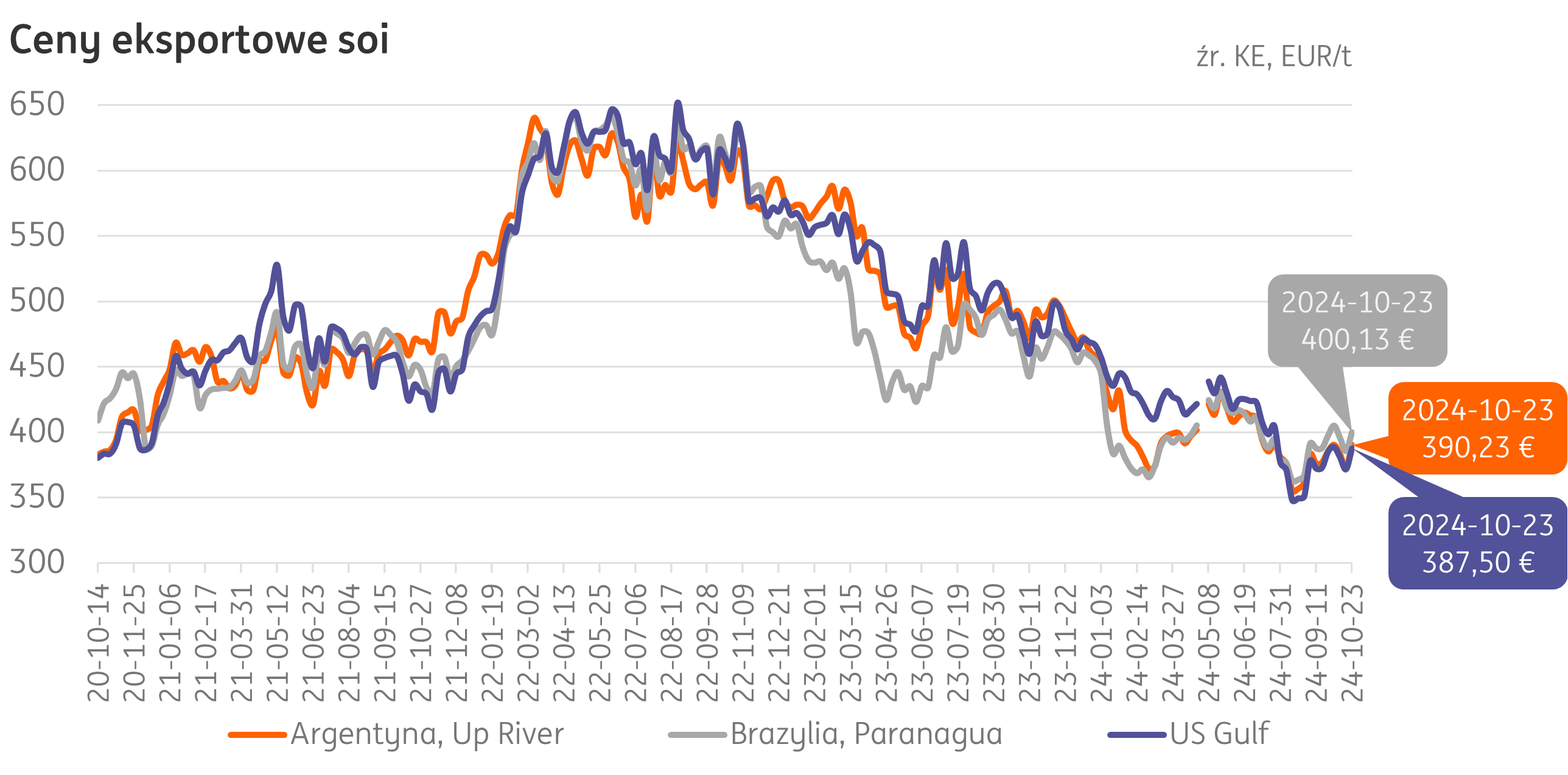 Ceny soi i śruty sojowej. Ceny soi eksportowe wzrosły minimalnie we wszystkich analizowanych portach w ujęciu miesięcznym. Najwyższa cena jest w Brazylii (Paranagua): 400 EUR/t, to wzrost o 1% m/m (-12% r/r). Cena w Argentynie (Up River) wzrosła o 1% w ciągu miesiąca, do poziomu 390 EUR/t (-20% r/r), a w USA (Gulf) na 23 października 2024 r. cena wzrosła do 388 EUR/t (+1% m/m; -18% r/r).
