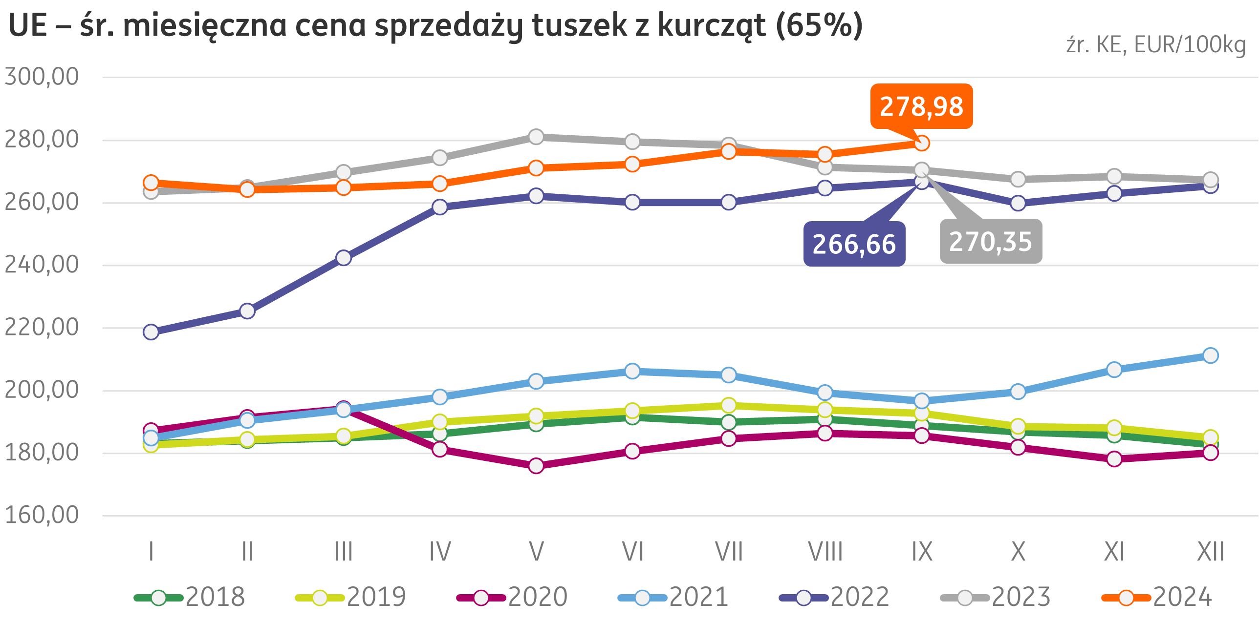 Unia Europejska. We wrześniu średnia ważona cena tuszki kurczaka (65%) w krajach Unii Europejskiej osiągnęła 278,98 EUR/100kg, podnosząc się o 1,3% w porównaniu do ubiegłego miesiąca i jest o 3,2% powyżej poziomu ubiegłorocznego.