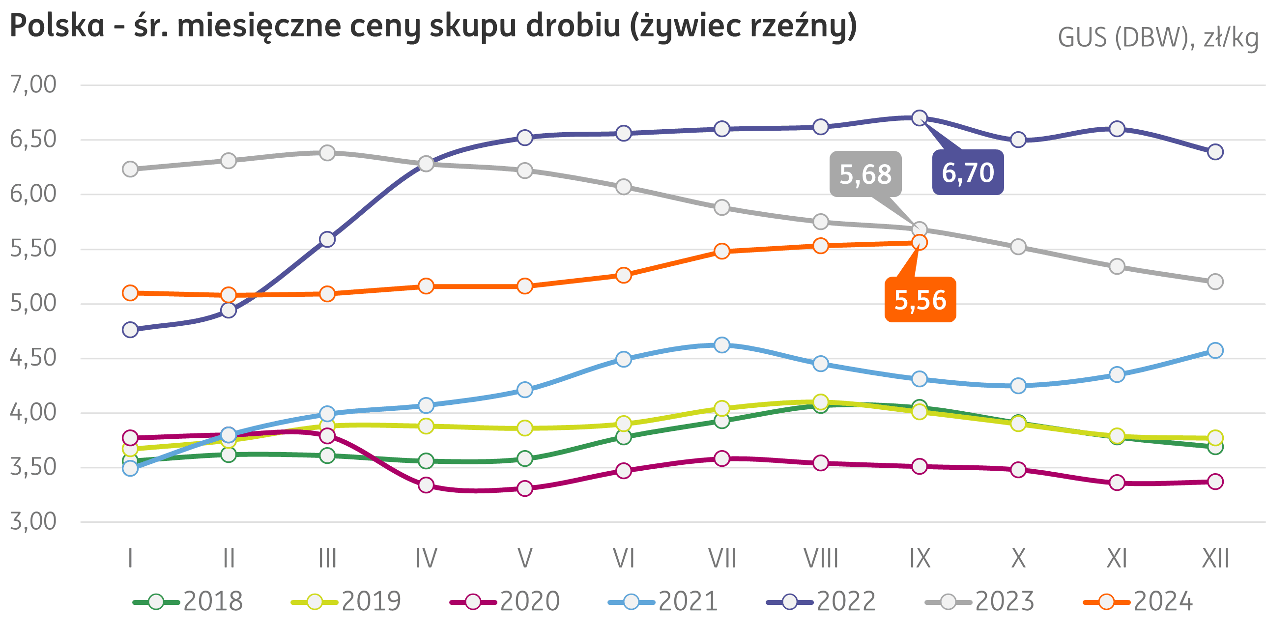 Ceny. We wrześniu średnia miesięczna cena skupu drobiu (żywiec rzeźny) w Polsce (dane GUS DBW) wzrosła do 5,56 zł/kg, o 0,5% w porównaniu do ubiegłego miesiąca. W zestawieniu z 2023 r., cena we wrześniu była o 2% niższa (-0,12 zł/kg r/r).