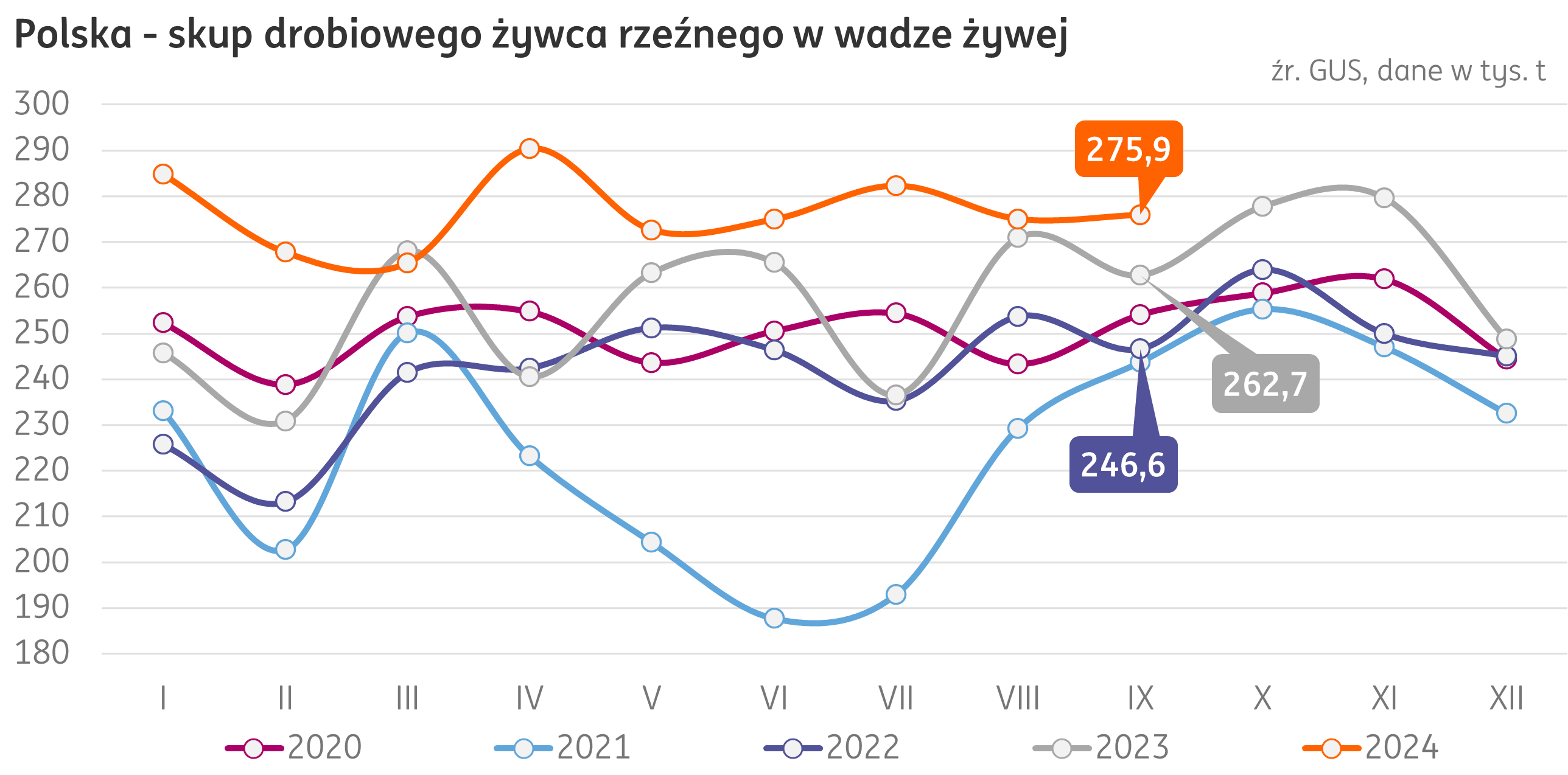 Produkcja. Skup drobiu w Polsce, zgodnie z Biuletynem Statystycznym GUS, osiągnął we wrześniu 2024 r. 276 tys. t, to wzrost o 5% w relacji rocznej. Po trzech kwartałach 2024 r. skup na poziomie 2694 tys. t o 9% przewyższa ten z analogicznego okresu ubiegłego roku (+214 tys. t r/r).