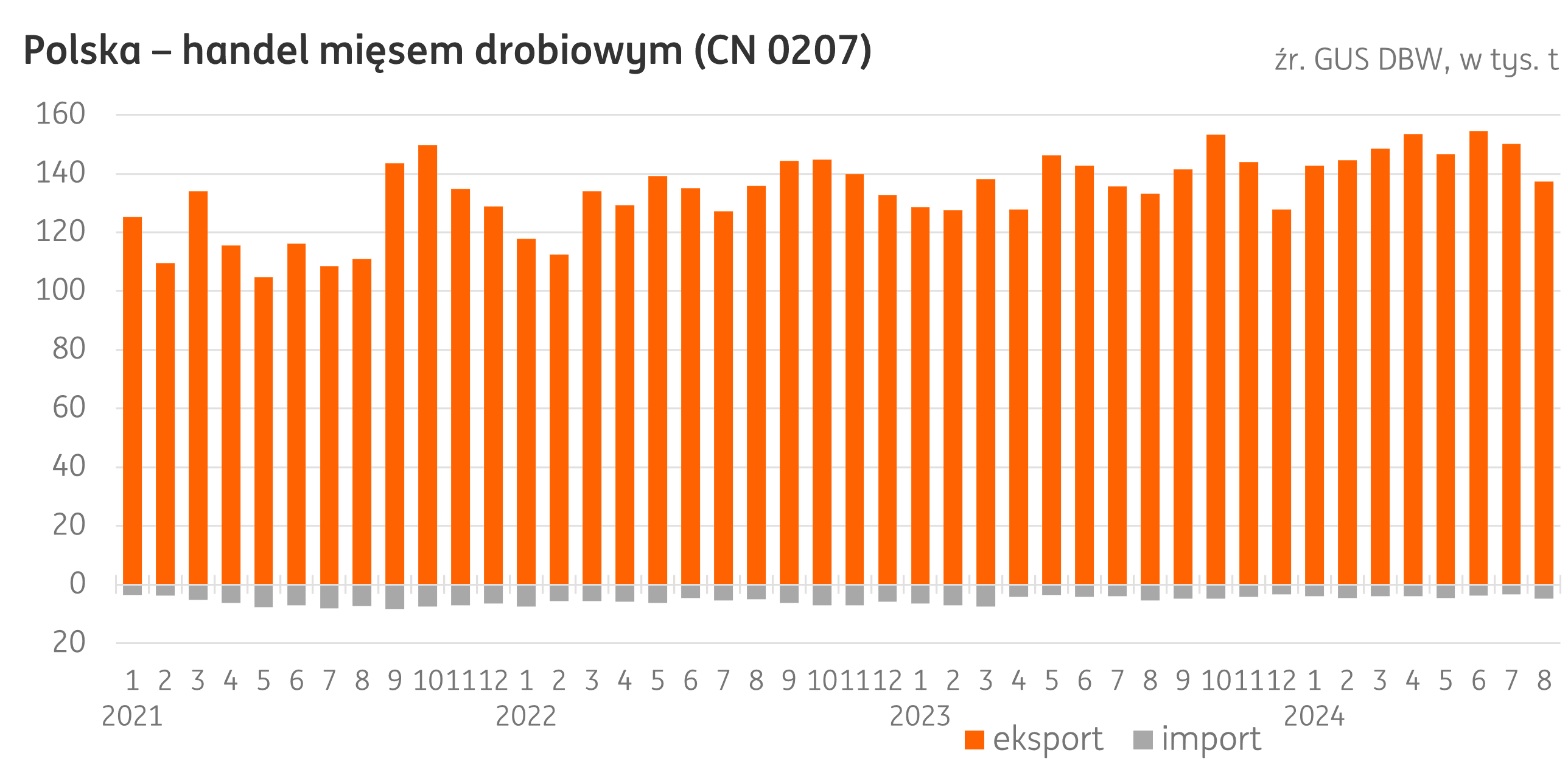 Handel. Na podstawie danych GUS (DBW) w okresie I-VIII 2024 r. eksport mięsa drobiowego w wadze produktu (CN 0207) był na poziomie 1178 tys. t, większy o 9% (+98 tys. t r/r) w porównaniu do analogicznego okresu ubiegłego roku. Import tego produktu osiągnął w analizowanym okresie 33 tys. t, spadając o 22% w relacji do 2023 r. (-9 tys. t r/r).