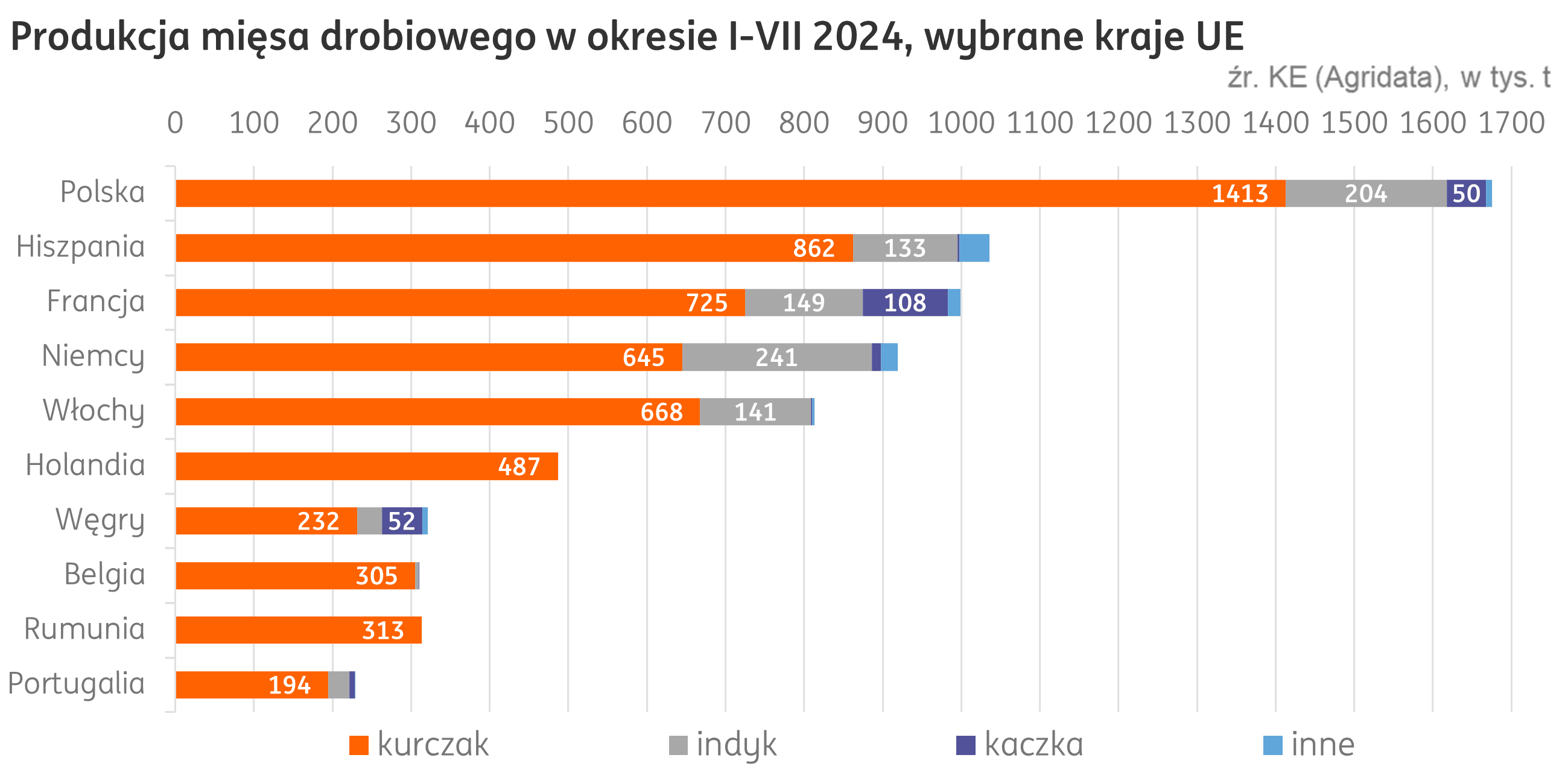 Unia Europejska. W ciągu siedmiu miesięcy 2024 r. kraje UE wyprodukowały 8,0 mln t drobiu (wg portalu Agridata), o 7% więcej niż w analogicznym okresie ubiegłego roku. Polska, największy producent drobiu w Europie, osiągnęła produkcję 1,7 mln t, stanowiącą 21% produkcji w UE w tym okresie, to również o 6% więcej niż rok wcześniej. Hiszpania, drugi kraj UE pod względem wielkości produkcji drobiu, osiągnęła wolumen 1,0 mln t i wzrost produkcji o 4% w relacji rocznej. Spory wzrost zanotowano również we Francji, o 17% w porównaniu do ubiegłego roku, przy produkcji 1,0 tys. t.