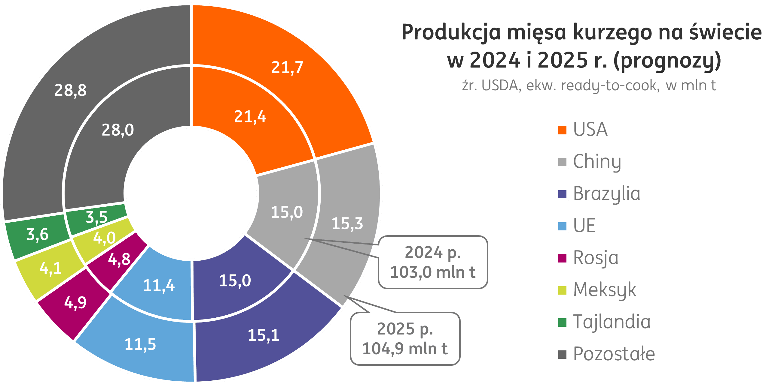 Świat. Zaktualizowane przez Departament Rolnictwa Stanów Zjednoczonych (USDA) kwartalne prognozy wskazują na globalną produkcję mięsa kurzego w 2025 r. na poziomie 104,9 mln t, o 1,9 mln t powyżej poziomu produkcji przewidywanej w 2024 r. Największym producentem, jak również największym konsumentem mięsa kurzego, pozostają Stany Zjednoczone, których produkcja ma osiągnąć 21,7 mln t w przyszłym roku (+1,6% r/r). Drugi największy producent, Brazylia, osiągnie wolumen 15,3 mln t (+2,0% r/r).