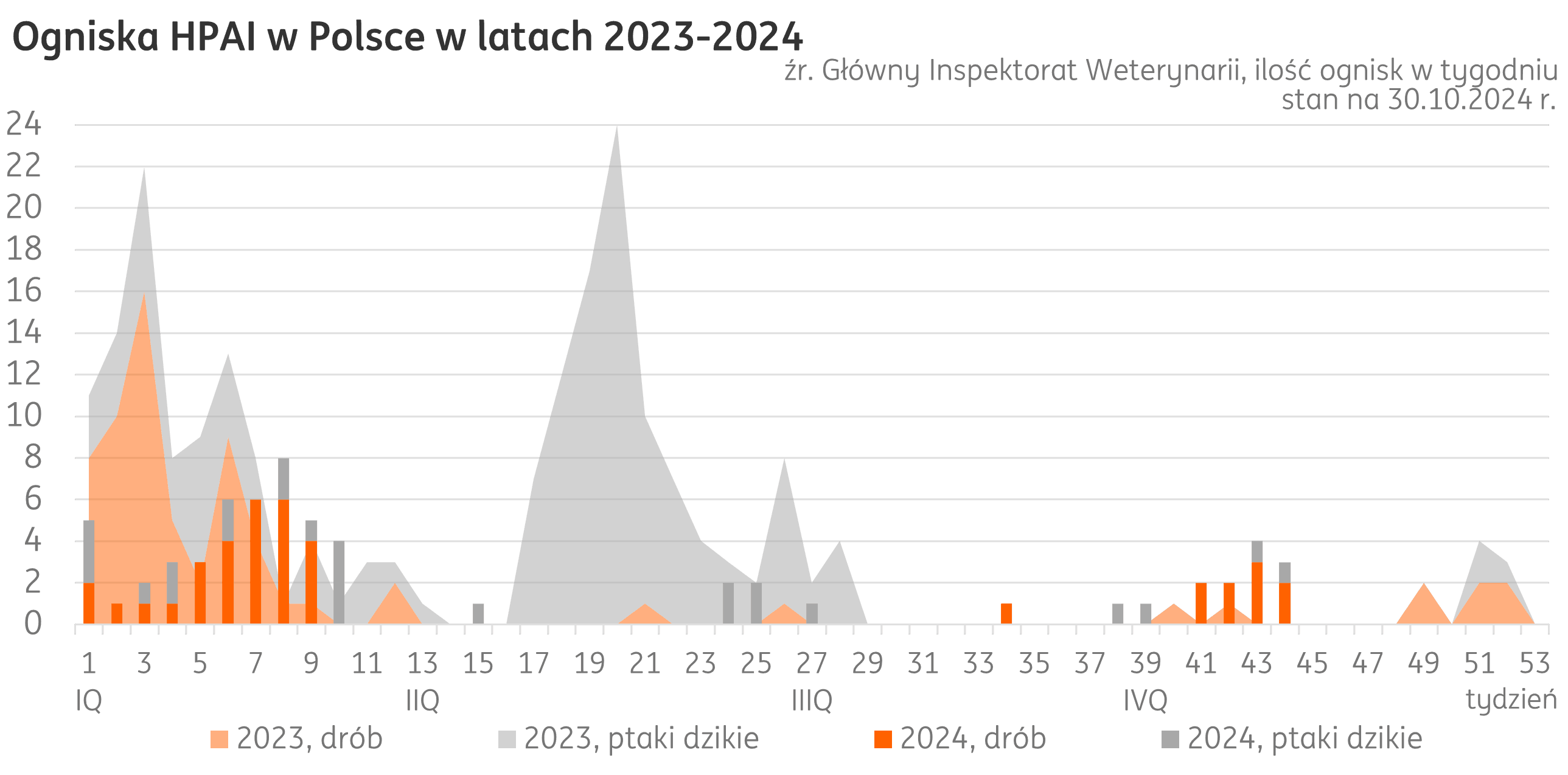 Dziewięć nowych przypadków wysoce zjadliwej grypy ptaków (HPAI) zostało potwierdzonych w październiku w Polsce. Trzy z nich dotknęły hodowli komercyjnych w województwie dolnośląskim, pozostałe sześć – Wielkopolski. Od początku roku stwierdzono 35 ognisk tej choroby wśród ptaków. W październiku potwierdzono również dwa nowe przypadki HPAI wśród ptaków dzikich, to 25 ognisk w tym roku.