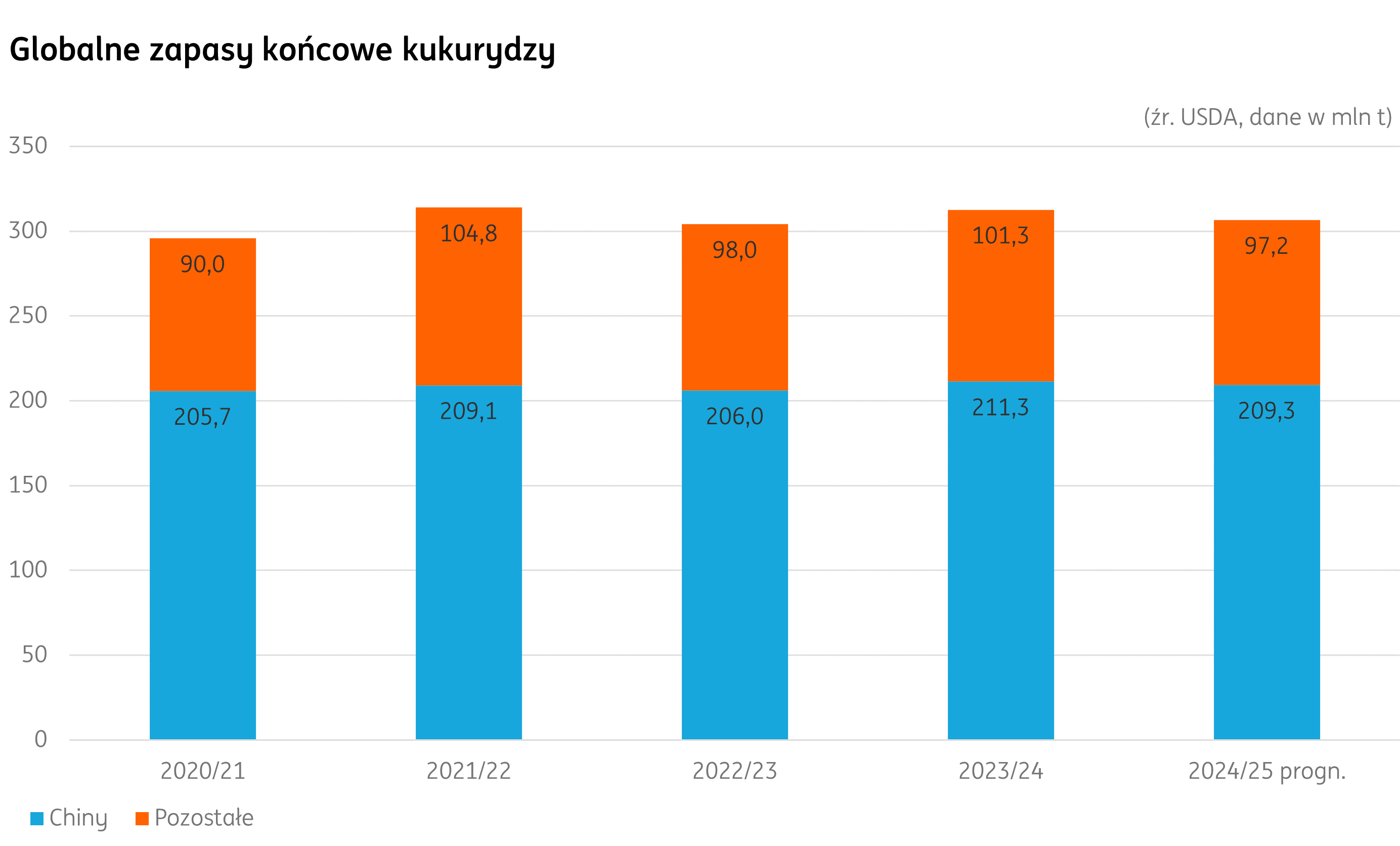 We październiku prognoza zapasów końcowych obniżyła się. Ich wolumen szacowany jest na niewiele ponad 306,5 mln t. Pogłębia się różnica w stosunku do poprzedniego roku - ostatnia korekta sprawiła, że wartość stała się niższa niż na koniec poprzedniego sezonu 2023/24 (-2%).