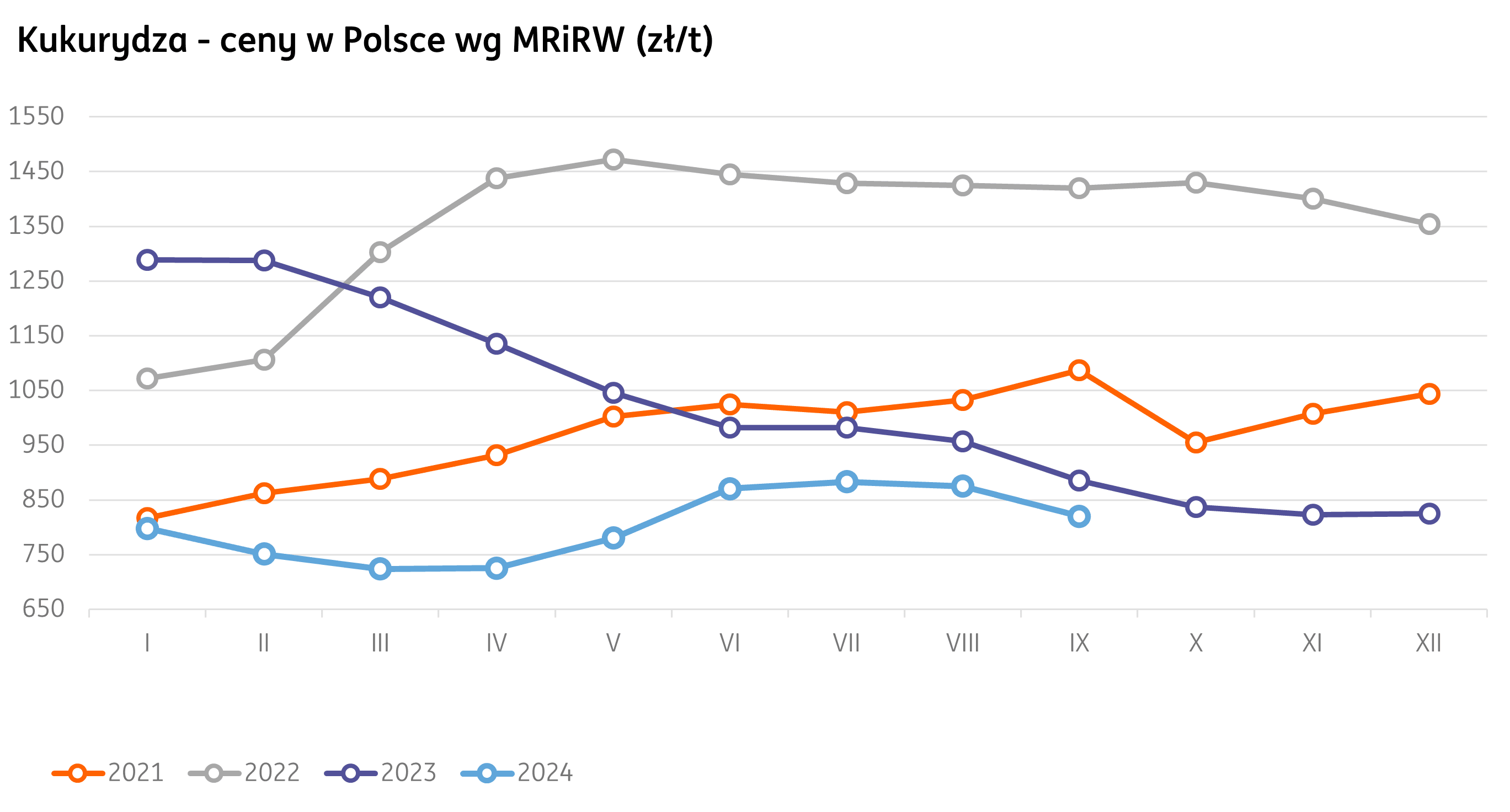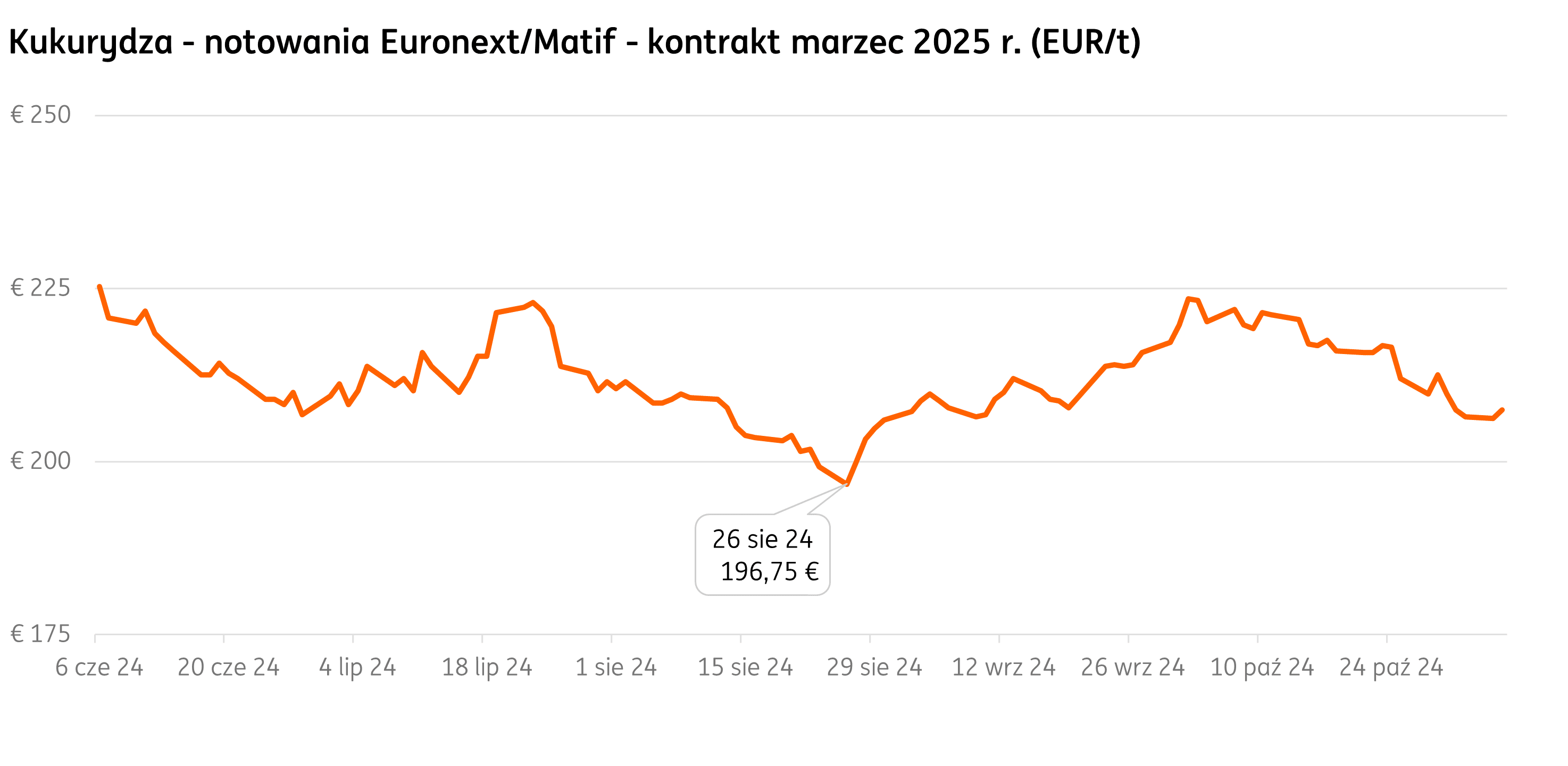 Przełom miesiąca dla najbliższego kontraktu był wzrostowy. Między wrześniem a październikiem notowania kukurydzy z terminem zapadalności na marzec 2025 r. umacniały się przekraczając 220 €. Zmianę trendu w połowie miesiąca poprzedziła kilkudniowa stabilizacja. Pod koniec października stawki spadły poniżej pułapu 210 €.