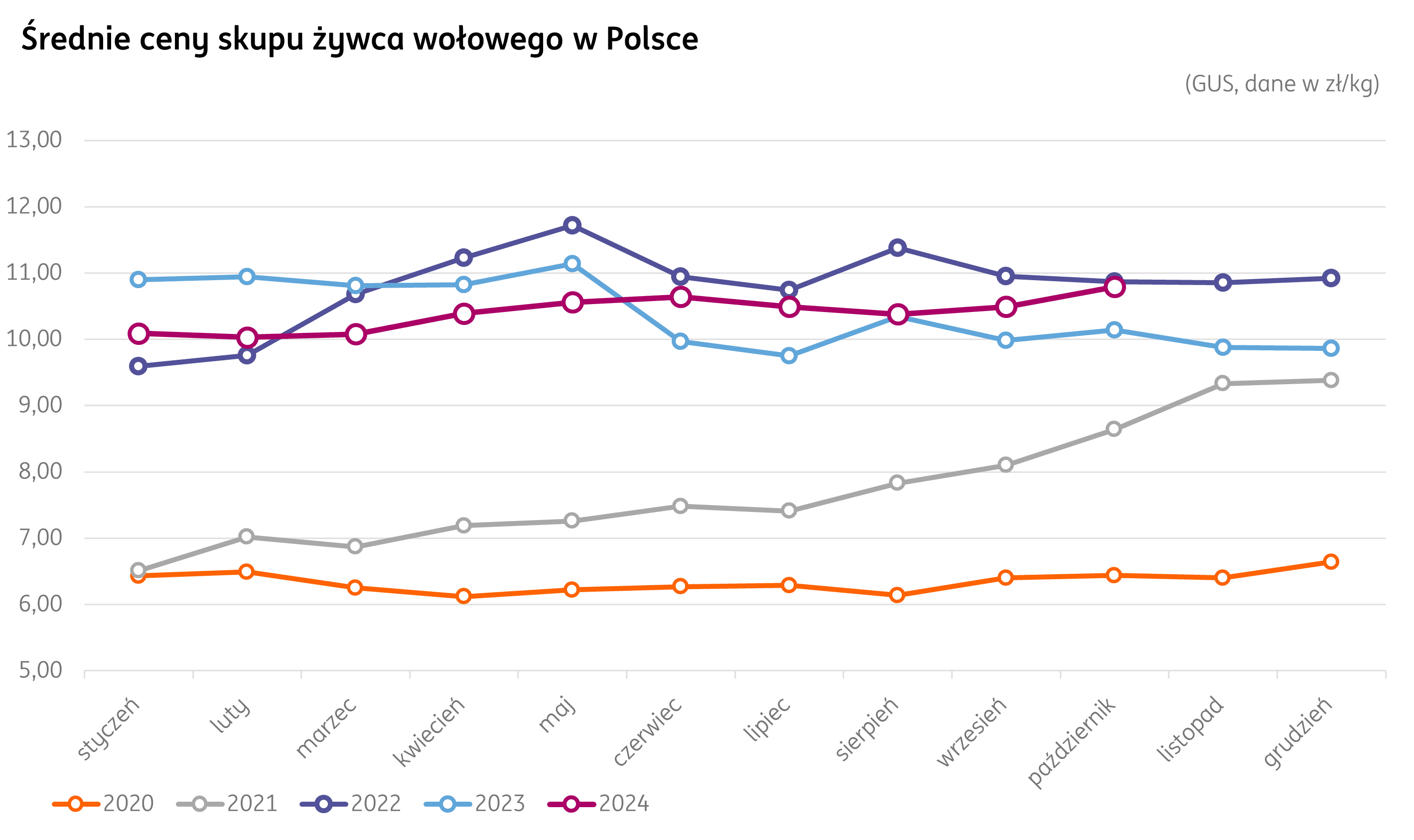W październiku średnie stawki za bydło mięsne drugi miesiąc z rzędu odnotowały wzrost. Cena 10,79 zł/kg jest 30 gr wyższa niż we wrześniu. W stosunku do zeszłego roku bieżący poziom jest wyższy o 65 groszy.