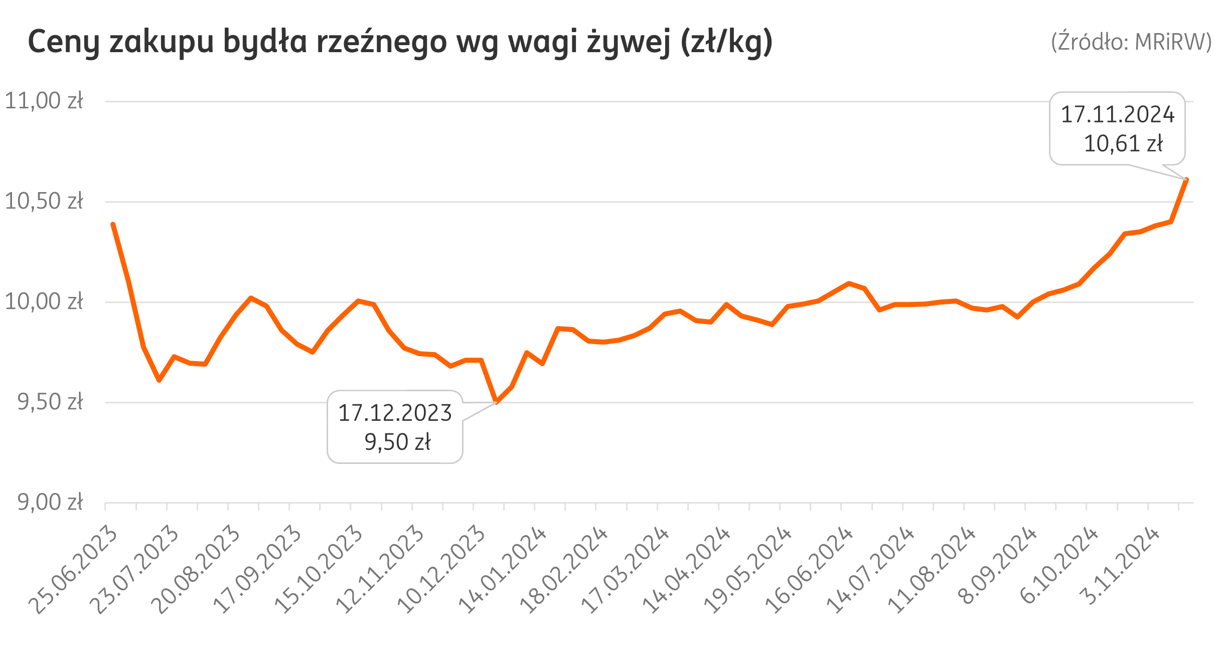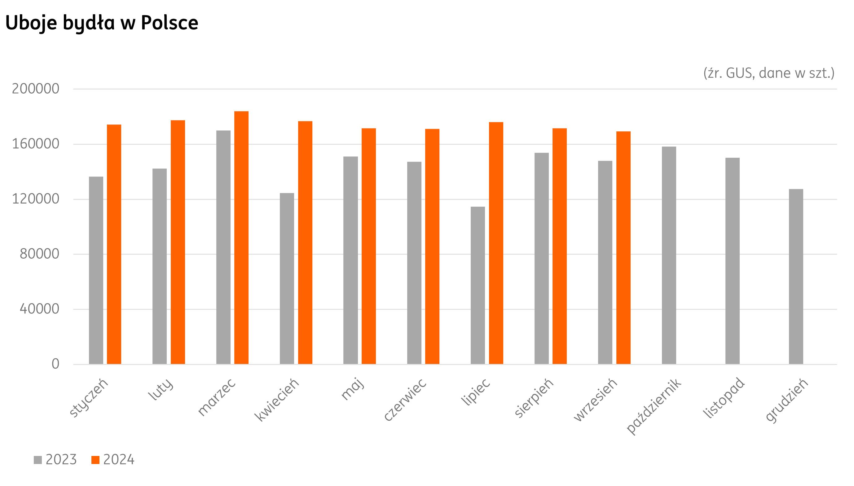 Branża bydła i wołowiny jest najbardziej stabilnym sektorem mięsnym w Polsce. Ceny żywca od sierpnia znajdują się w trendzie wzrostowym. Przeciętne stawki umocniły się w tym czasie o 5%. Mocno rośnie wolumen ubojów. Podobnie jest w innych krajach z regionu środkowo-wschodniej Europy na co wpływały negatywne warunki wypasu. Zbilansowana sytuacja popytowo-podażowa dopełniana jest przez podobnie wzmacniający się w tym roku eksport wołowiny na rynki trzecie. W 2023 r. Polsce zostały wydane pozwolenia na eksport surowca do Chin i Wietnamu, w tym roku do tego grona doszła Algieria. Dynamicznie rośnie eksportu polskiej wołowiny do Turcji (80% r/r).