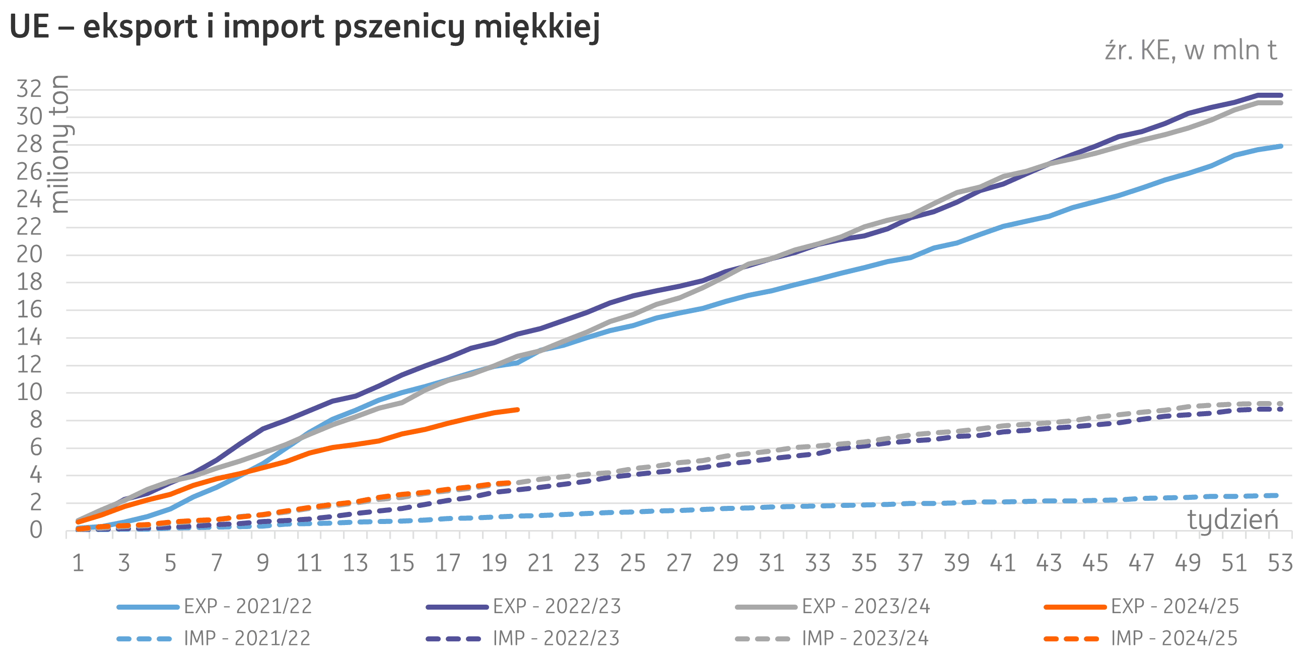 Unia Europejska. Eksport pszenicy w dwudziestu pierwszych tygodniach sezonu 2024/25 osiągnął o 31% niższe wyniki niż rok wcześniej z wolumenem na poziomie 8,8 mln t (wstępne dane opublikowane przez KE). Dwa główne kierunki w okresie 1.07-17.11.2024 to Nigeria z wolumenem 1 410 tys. t, kolejne są Wielka Brytania oraz Egipt, eksport do tych krajów osiągnął w owym czasie odpowiednio 696 tys. t i 692 tys. t. Import w analizowanym okresie był na poziomie 3,5 mln t, o 1% wyższy w relacji rocznej. 70% (2,5 mln t) importowanej w tym okresie pszenicy pochodziło z Ukrainy (+213 tys. t, +9% r/r).