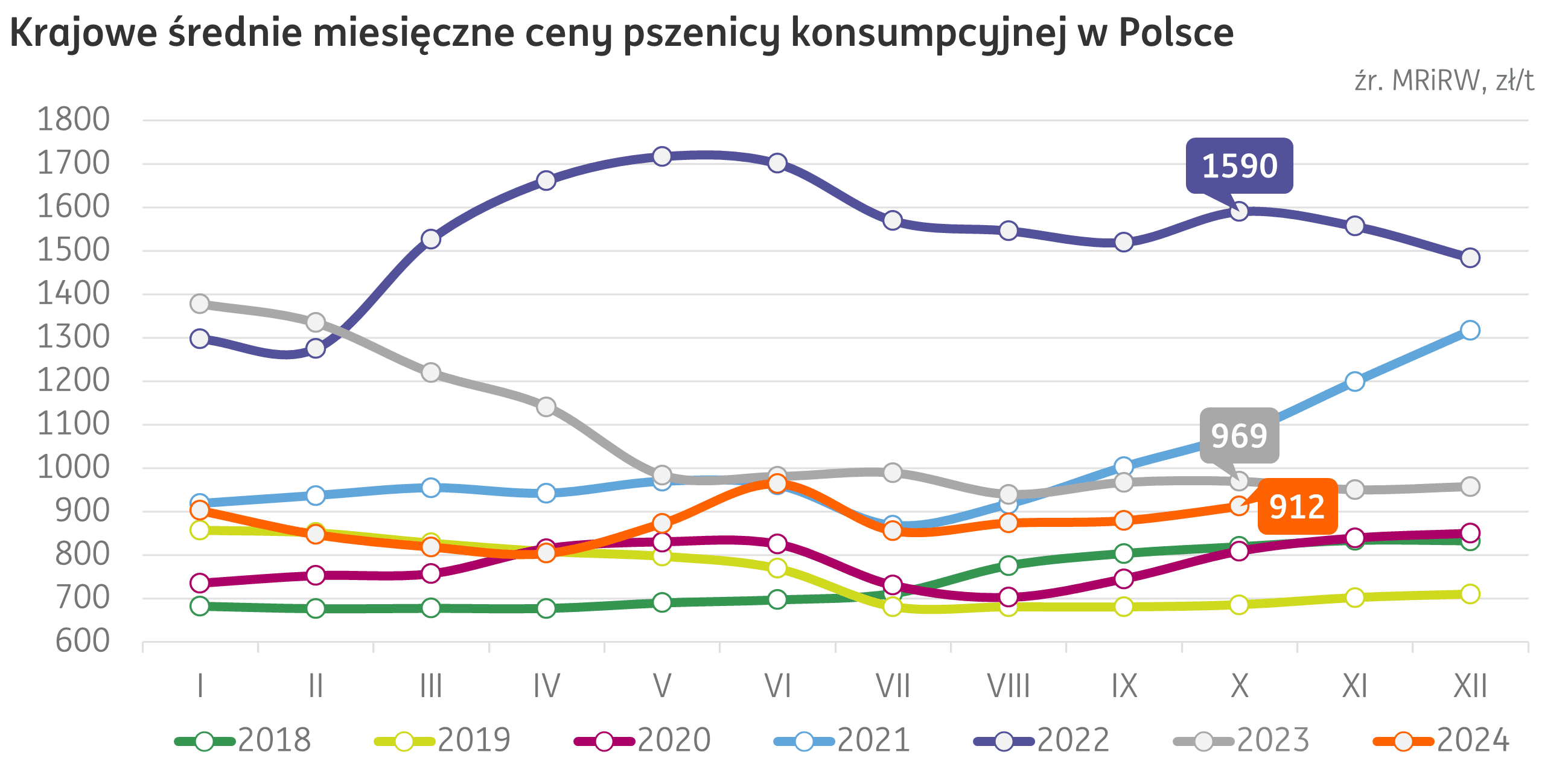 Cena. Cena pszenicy konsumpcyjnej w Polsce wzrosła w październiku o 4% m/m i kształtowała się na średnim poziomie 912 zł/t (+33 zł/t m/m; biuletyn MRIRW). W porównaniu do października ubiegłego roku, cena jest niższa o 57 zł/t (-6% r/r). Na rynku krajowym na 17 listopada 2024 r. średnie ceny pszenicy konsumpcyjnej kształtowały się w przedziale 827-971 zł/t.