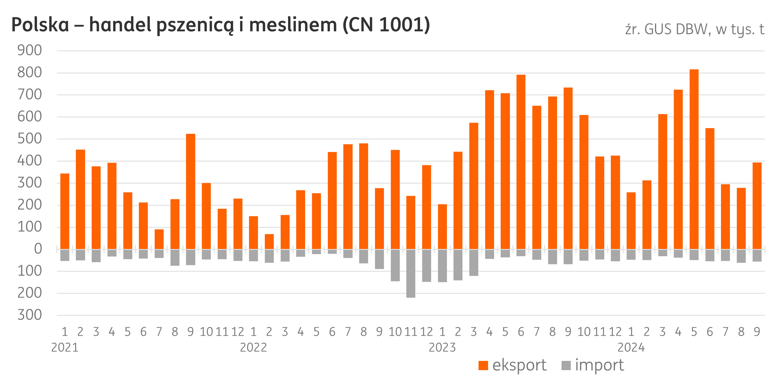 Handel. Po trzech miesiącach sezonu 2024/25 eksport pszenicy jest znacznie obniżony w porównaniu do ubiegłego roku, według danych dostępnych na portalu GUS (Dziedzinowe Bazy Wiedzy), osiągnął 968 tys. t, o 53% poniżej poziomu z ubiegłego sezonu. We wrześniu eksport pszenicy to 394 tys. t, o 46% niżej niż we wrześniu ubiegłego roku. Import od początku sezonu również pozostaje na poziomie niższym do ubiegłorocznego z wolumenem 169 tys. t (-8% r/r), a w samym wrześniu osiągnął 55 tys. t, o 18% niżej niż przed rokiem.