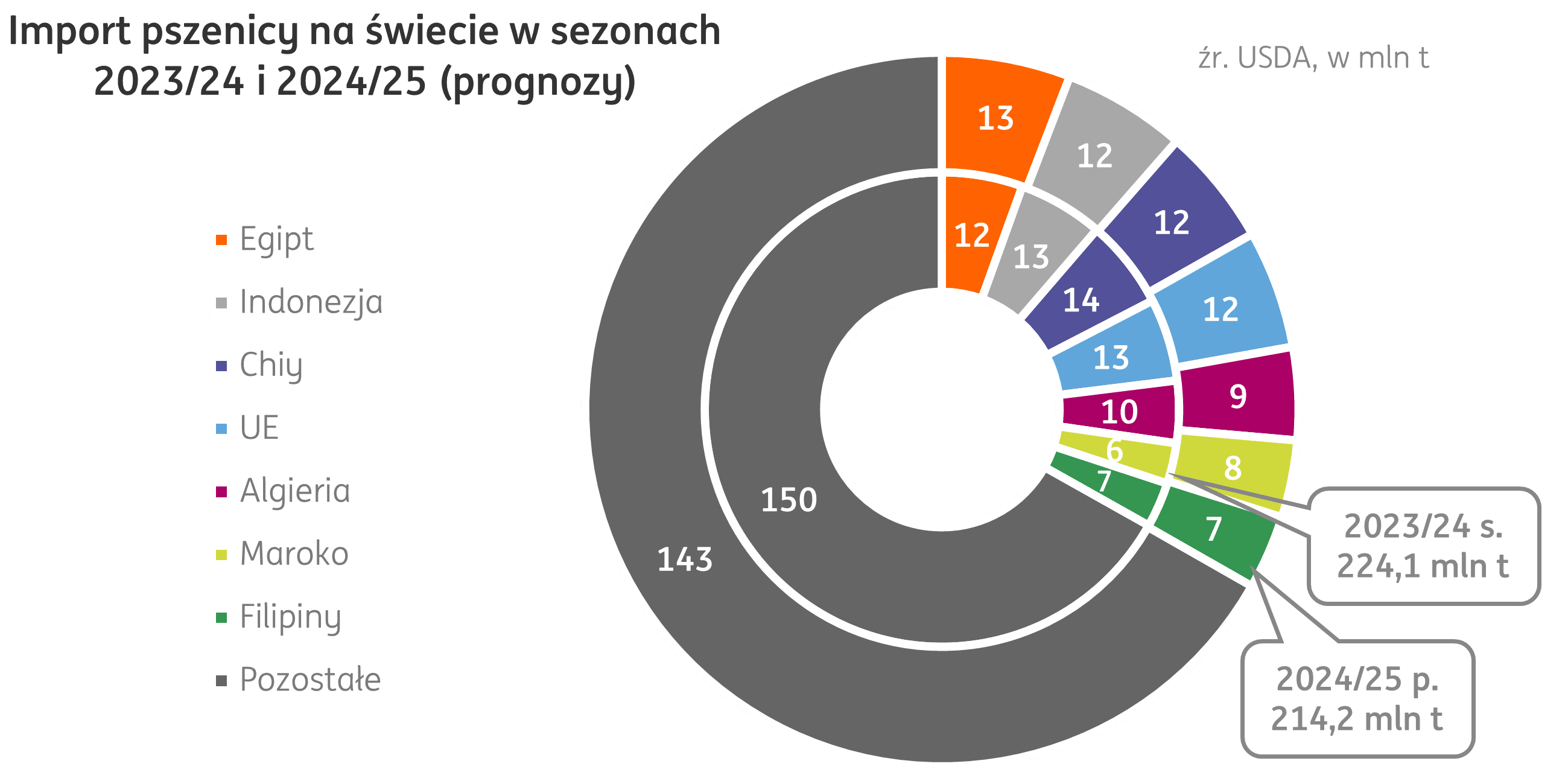 Prognozy importu dla Egiptu również zostały podniesione, do 12,5 mln t (-0,5 mln t), co czyni ten kraj największym importerem pszenicy w bieżących raportach. Zmniejszono natomiast prognozowany poziom dostaw pszenicy do Chin (-0,5 mln t) oraz do Turcji (-0,5 mln t).