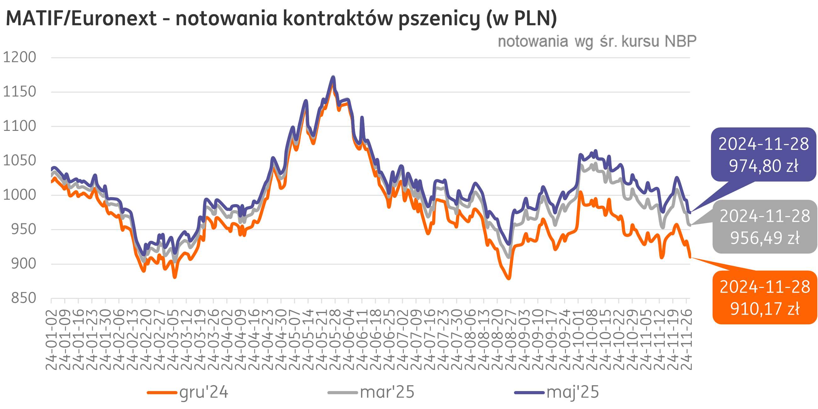 Ceny grudniowych kontraktów pszenicy na giełdzie EURONEXT/MATIF na miesiąc przed ich zamknięciem notowały wahania na poziomie kilku euro. 28 listopada ukształtowały się w wysokości 211,25 EUR/t, co oznacza spadek o 2,6% m/m i wartość bliską tej osiąganej przed rokiem.