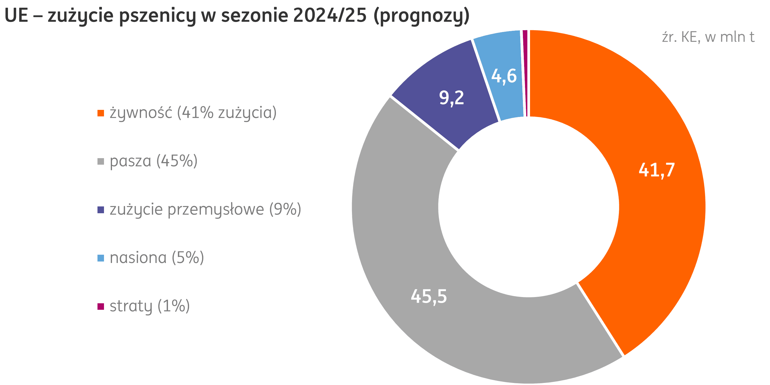 Świat. W listopadowych raportach USDA globalne zużycie pszenicy w sezonie 2024/25 również zostało podwyższone, do 803,4 mln t (+0,9 mln t). W porównaniu do raportów z października, najistotniejsze zmiany, to podniesienie zużycia w Turcji (+0,2 mln t ) oraz obniżenie go w Rosji (-0,5 mln t). Bieżące prognozy plasują globalne zużycie w tym sezonie o 5,7 mln t powyżej sezonu 2023/24 (+0,7% r/r).