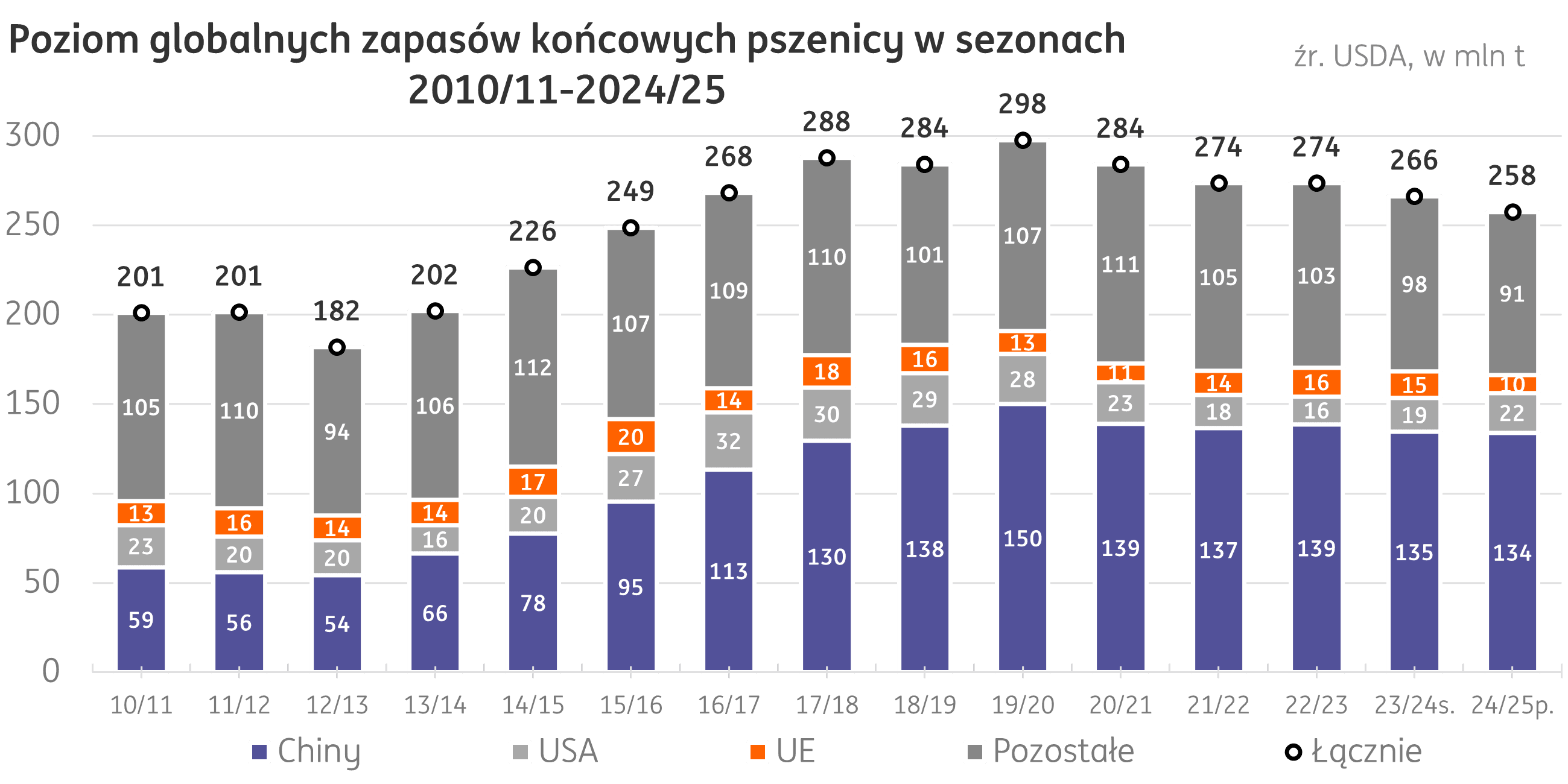 Świat. Zapasy pszenicy na koniec sezonu 2024/25 są prognozowane przez USDA w listopadzie na poziomie 257,6 mln t, to o 8,7 mln t (-3% r/r) mniej w porównaniu do ubiegłego sezonu. Ponad połowa ma znajdować się w Chinach, których zapasy mają pozostać na poziomie 134,0 mln t, porównywalnie do ubiegłego roku. Istotne zmiany w relacji rocznej zaszły w przypadku Stanów Zjednoczonych, których zapasy zwiększą się do 22,2 mln t, a to poziom najwyższy od zapasów końcowych z sezonu 2020/21. Najwięksi eksporterzy pszenicy będą mieli pod koniec bieżącego sezonu zapasy znacznie obniżone, UE do 10,1 mln t (-32% r/r), a Rosja do 7,2 mln t (-38% r/r).