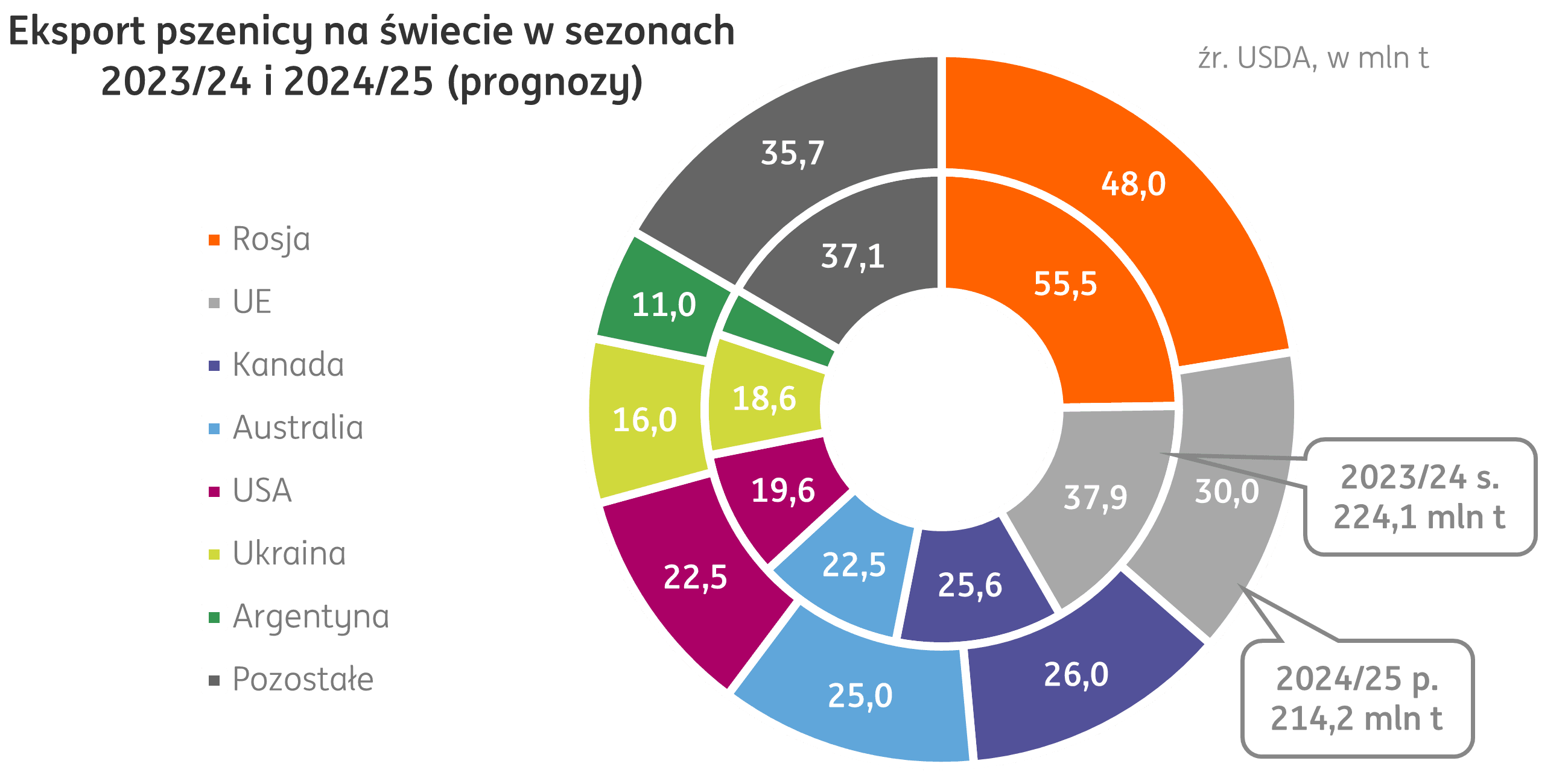 Świat. Listopadowa edycja raportów Departamentu Rolnictwa Stanów Zjednoczonych zawiera podwyższone o 0,7 mln t globalne prognozy produkcji pszenicy, jej wolumen ma w sezonie 2024/25 osiągnąć 794,7 mln t. Główny wpływ na podniesione prognozy mają szacunki produkcji pszenicy Kazachstanu, zwiększone o 2 mln t do 18 mln t. W listopadzie zmniejszono natomiast prognozy dla UE (-0,4 mln t), Rosji (-0,5 mln t), Argentyny (-0,5 mln t) oraz dla Brazylii (-0,5 mln t). Bieżący poziom prognozowanej przez USDA produkcji o 4,3 mln t przekracza tę osiągniętą w ubiegłym sezonie (+0,5% r/r).