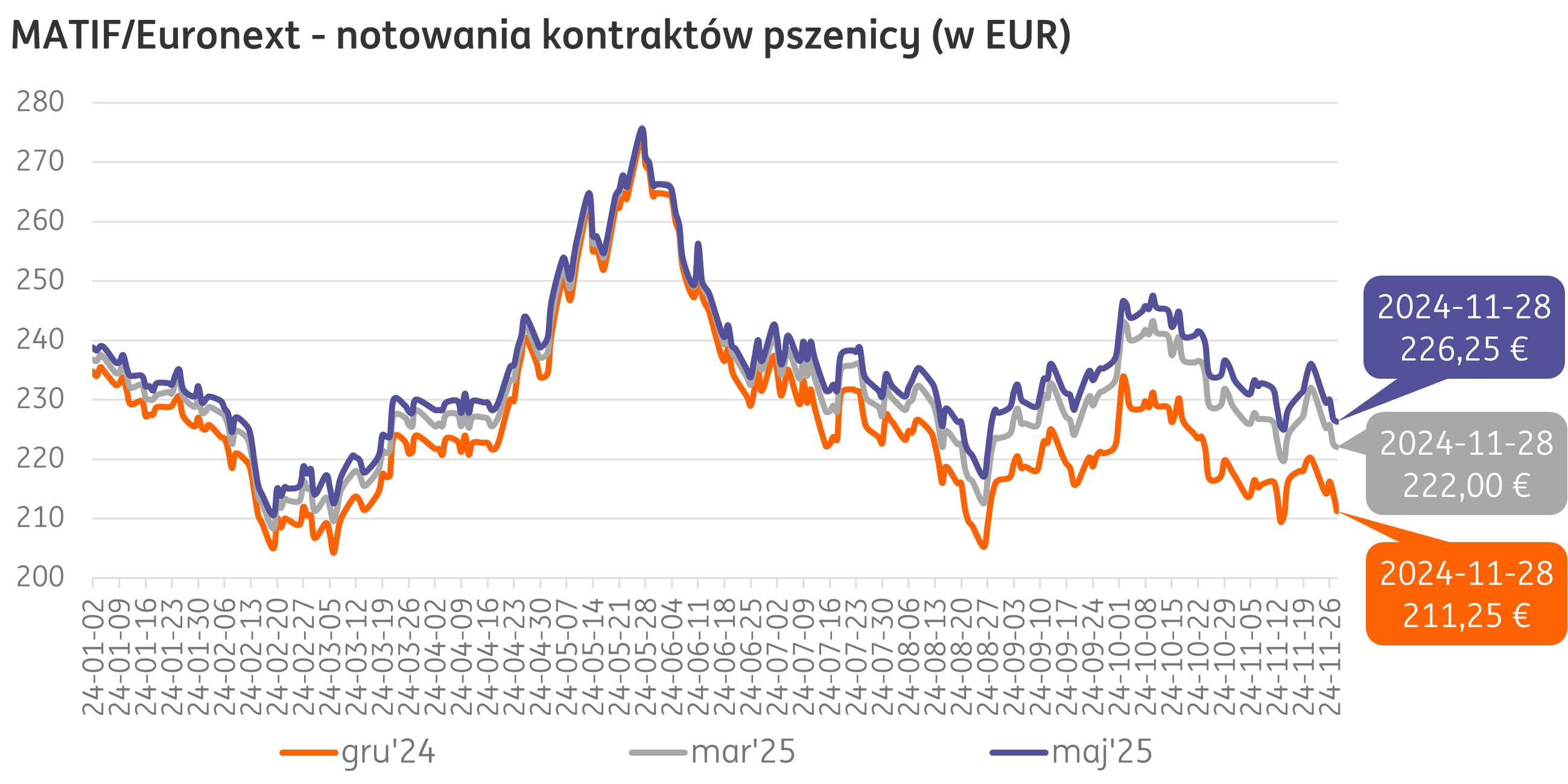 Cena grudniowego kontraktu pszenicy 28 listopada 2024 r. była na zamknięciu na poziomie 211,25 EUR/t, spadając o 5,75 EUR/t (-2,6% m/m) w porównaniu do poprzedniego miesiąca. Kontrakt marcowy był notowany na poziomie 222,00 EUR/t, natomiast majowy na poziomie 226,25 EUR/t.