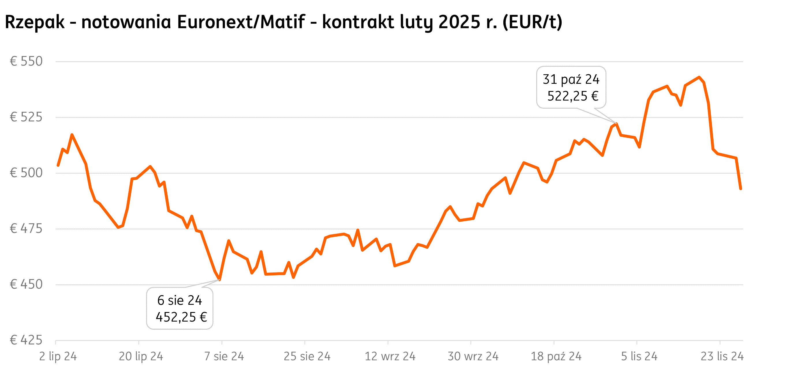 Rzepak wszedł w nowy miesiąc utrzymując trend wzrostowy. Kontynuował passę trwającą od połowy września, przekraczając w połowie miesiąca pułap 543 €. Następnie doszło do sporej korekty o niemal 7%. W kolejnych dniach spadki wyhamowały, a ceny zatrzymały się na poziomie 510 €. Stabilizacja była jednak krótkotrwała, ostatnie dni listopada to obniżka poniżej granicy 500 €.