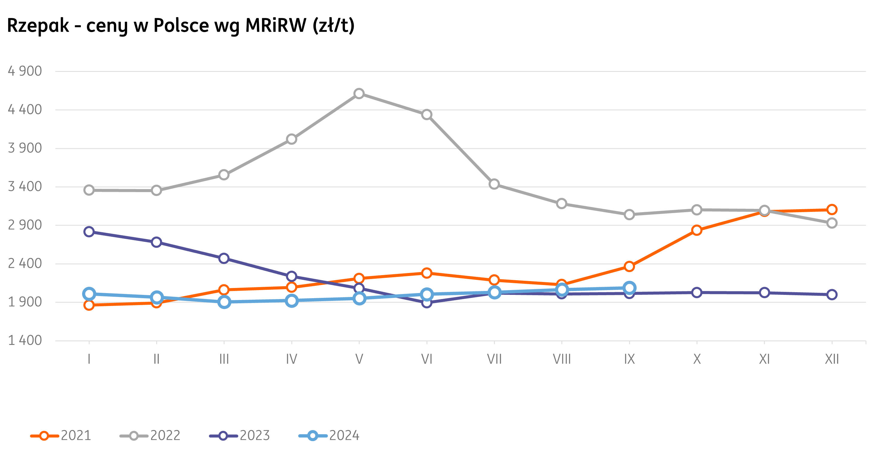 Rzepak przez większość listopada kontynuował trwający od września trend wzrostowy. Sprzyjały temu umacniające się oleje roślinne (palmowy i sojowy) na światowych rynkach. Skutkowało to najwyższą ceną rzepaku na Euronext/Matif od lutego 2023 r. Dodatkowo na europejskim rynku podwyżkom sprzyjała aktualizacja raportu USDA, w którym nieznacznie skorygowano w dół szacunki produkcji w bieżącym sezonie 2023/24 oraz osłabienie euro względem dolara. Jednak notowania rzepaku miesiąc zamknęły ze stratą. Najbliższy (na luty 2025 r.) taniał o 1,5% w stosunku do stanu sprzed miesiąca. Wynikało to z dużej korekty w ostatniej dekadzie listopada, która dotyczyła całego kompleksu oleistych na całym świecie. W dalszym ciągu najbliższe europejskie kontrakty są droższe niż przed rokiem (zob. tab.).