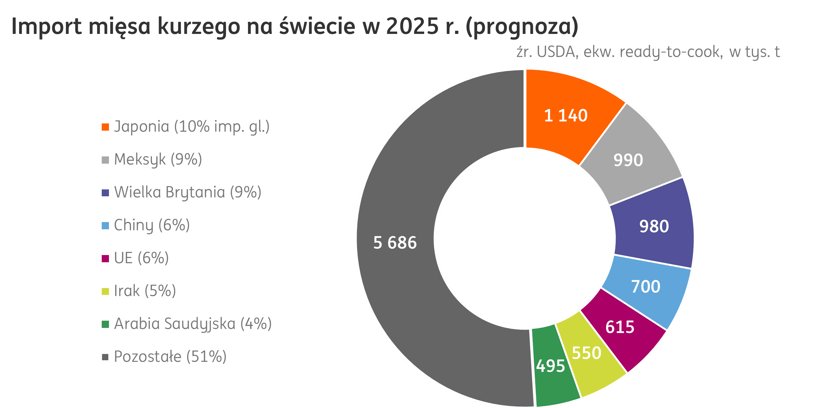 Świat. Globalny handel mięsem kurzym ma w 2025 r. osiągnąć wolumen 13,8 mln t (prognozy USDA), to wzrost o 0,3 mln t w relacji rocznej. Podczas gdy za 81% wolumenu odpowiadają czterej eksporterzy (udział Brazylii: 36%, USA: 22%, UE: 13%, Tajlandii: 9%), importerzy są zdecydowanie bardziej rozproszeni. 10% globalnego importu mięsa kurzego trafia do Japonii, a kolejne, z 9% udziałem w imporcie, są Meksyk i Wielka Brytania.