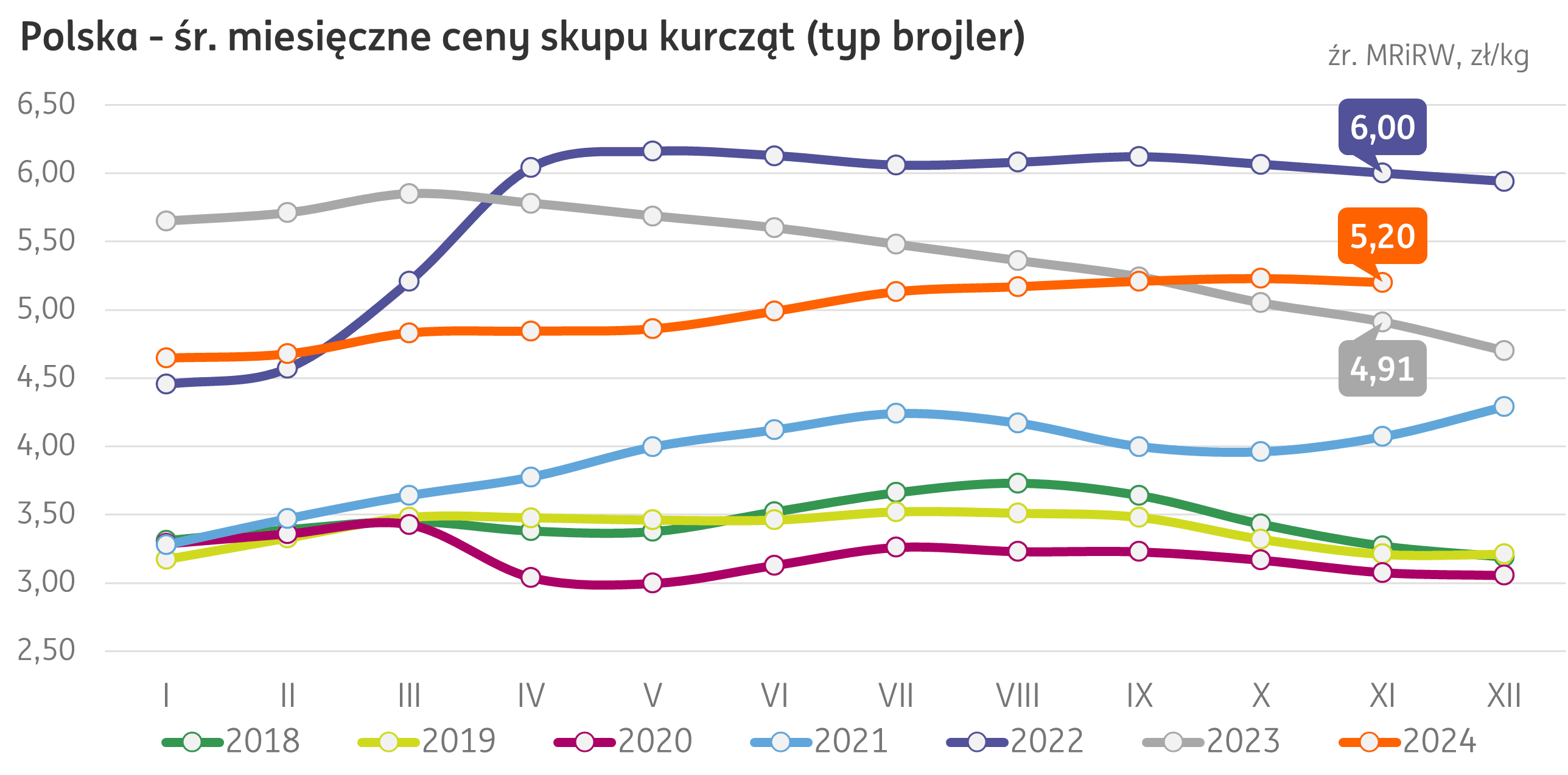 Ceny. Średnia miesięczna cena skupu kurcząt brojlerów (publikacja MRiRW) w listopadzie 2024 r. kształtowała się na poziomie 5,20 zł/kg, obniżając się (po raz pierwszy od stycznia) o 0,03 zł/kg w ujęciu miesięcznym. W relacji do listopada ubiegłego roku, cena jest wyższa o 6%.