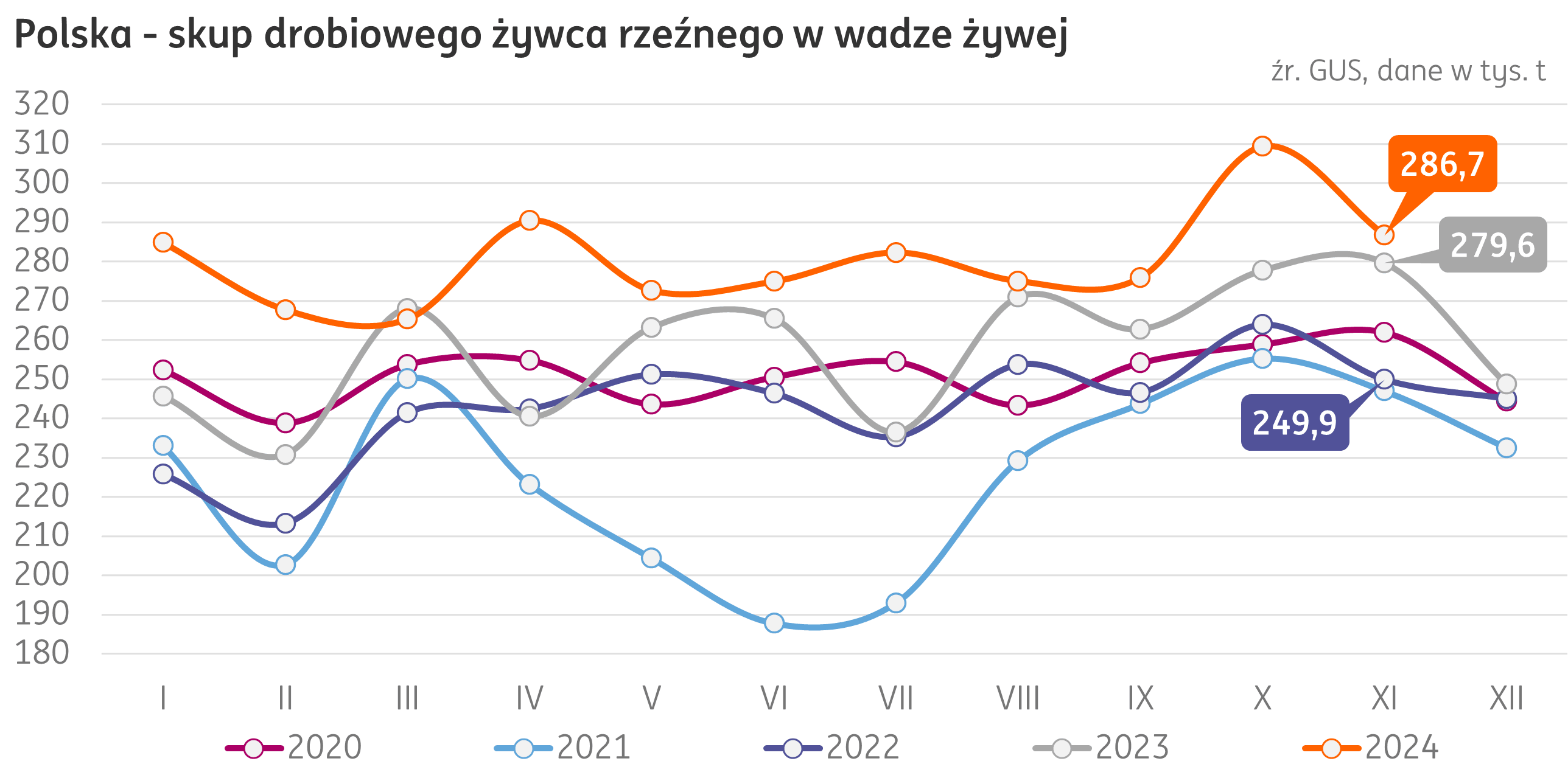 Produkcja. Skup drobiu w Polsce, zgodnie z Biuletynem Statystycznym GUS, podniósł się w listopadzie 2024 r. do 286,7 tys. t, o 2,5% r/r. W okresie I-XI 2024 r. skup na poziomie 3 290 tys. t o 8,3% przewyższa ten z analogicznego okresu ubiegłego roku (+252 tys. t r/r).