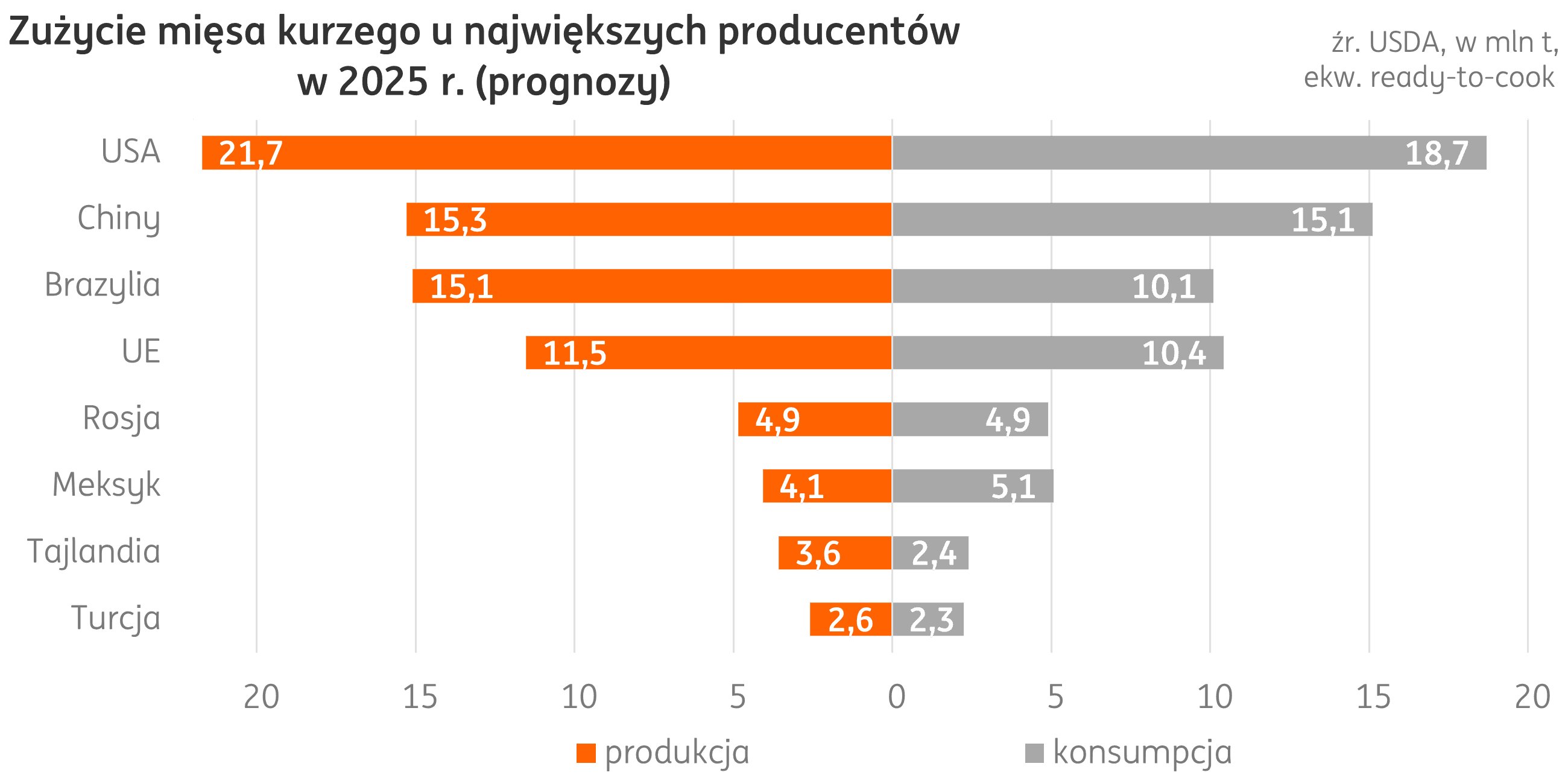 Świat. Globalna konsumpcja mięsa kurzego, jak wynika z jesiennego raportu Departamentu Rolnictwa Stanów Zjednoczonych (USDA) ma być największa również u największego producenta mięsa kurzego – USA i osiągnąć 18,7 mln t, wzrastając o 0,3 mln t r/r. Drugie pod względem konsumpcji są Chiny z 15,1 mln t, co oznacza wzrost o 0,3 mln t r/r, na kolejnym miejscu są kraje UE i konsumpcja 10,4 mln t mięsa kurzego, o 0,1 mln t więcej w porównaniu do 2024 r. W Brazylii, posiadającej największy udział w globalnym eksporcie, konsumpcja w 2025 r. osiągnie 10,1 mln t, utrzymując się na poziomie z roku poprzedniego.