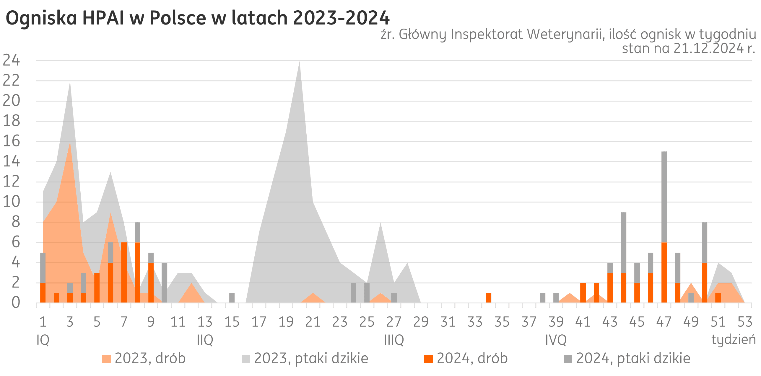 W grudniu do tej pory stwierdzono jedno ognisko ptasiej grypy u drobiu w hodowli komercyjnej – to znaczna poprawa wobec dziesięciu przypadków z listopada. Do 21 grudnia 2024 r. stwierdzono również cztery ogniska tej choroby wśród drobiu w chowie przyzagrodowym oraz osiem u ptaków dzikich.