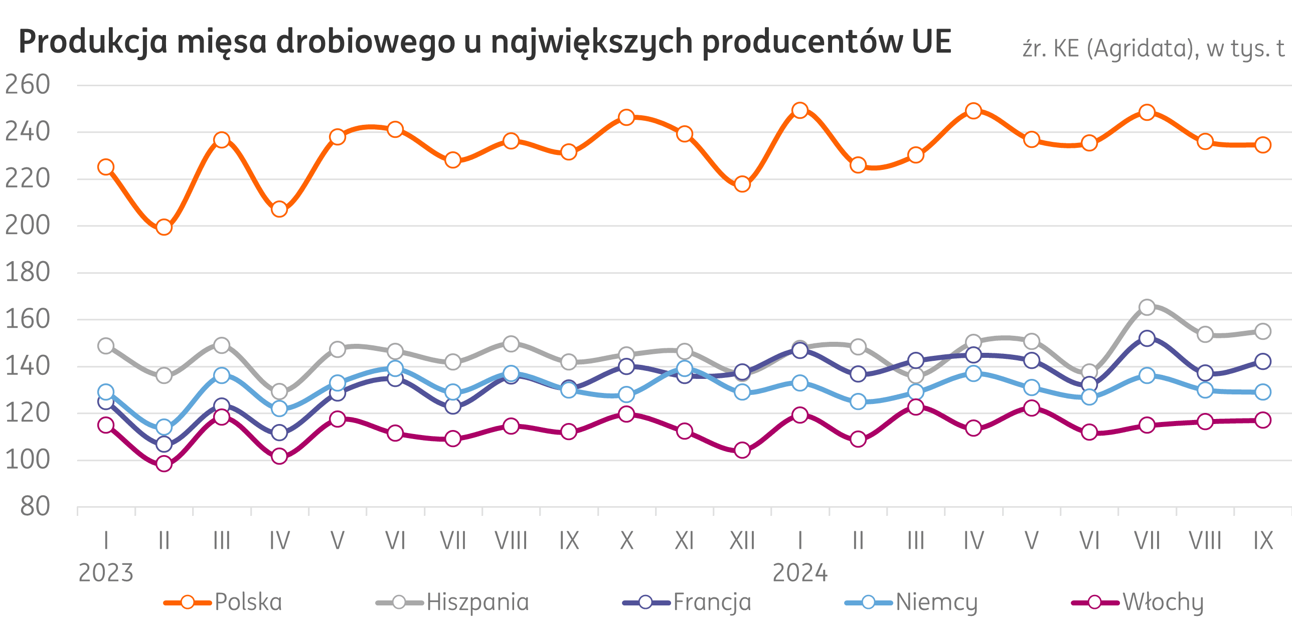 Unia Europejska. W ciągu trzech kwartałów 2024 r. produkcja drobiu w Unii Europejskiej, raportowana przez KE, osiągnęła 10,3 mln t (wg portalu Agridata), o 6% powyżej produkcji ubiegłorocznej. Polska, największy producent drobiu w Europie, wyprodukowała 2,1 mln t, stanowiącą 21% produkcji w UE w tym okresie, o 5% większą niż rok wcześniej. Hiszpania, drugi kraj UE pod względem wielkości produkcji drobiu, osiągnęła wolumen 1,3 mln t i wzrost produkcji o 4% w relacji rocznej. Spory wzrost zanotowano również we Francji, o 14% w porównaniu do ubiegłego roku, przy produkcji 1,3 tys. t.