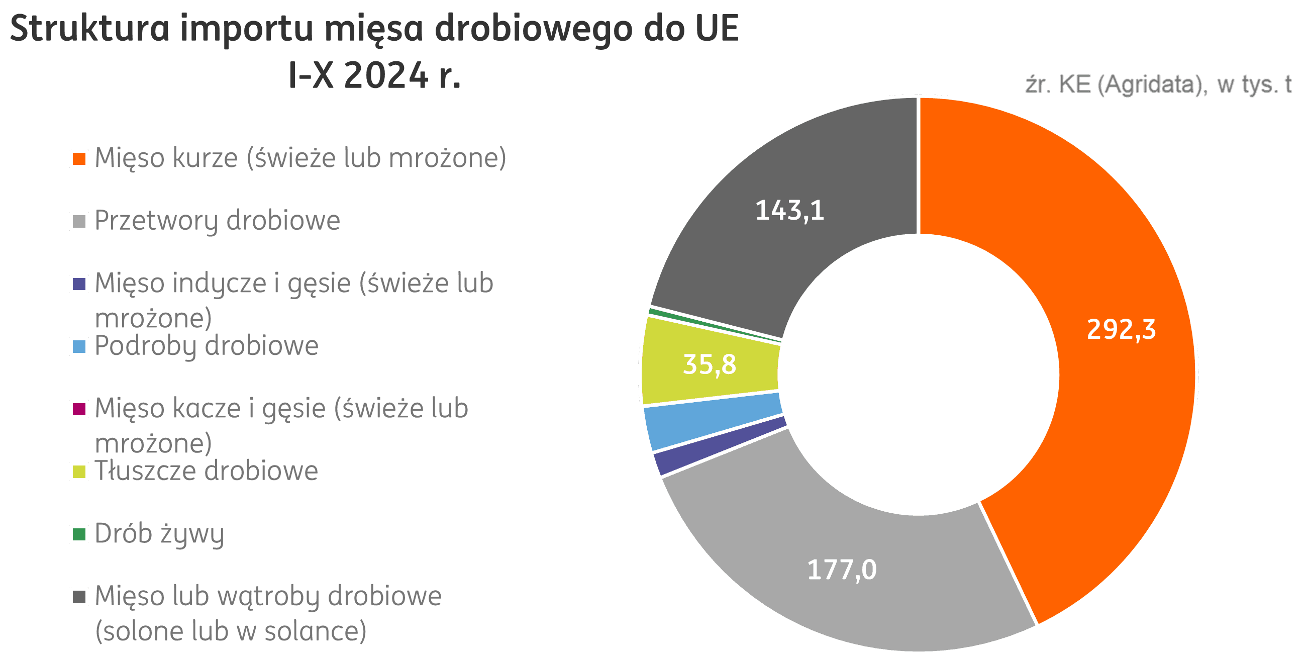 Unia Europejska. W miesiącach I-X 2024 r. eksport mięsa drobiowego poza granice UE wzrósł o 8% r/r, osiągając wolumen 1 663 tys. t. (wg portalu Agridata). Do najliczniej eksportowanej kategorii należało mięso kurze (świeże lub mrożone), jego eksport w analizowanym okresie to 1 200 tys. t (+11% r/r). 38% wyeksportowanego mięsa drobiowego pochodziło z Polski, w analizowanym okresie wolumen eksportu osiągnął 635 tys. t, o 19% więcej niż w ubiegłym roku. Druga, Holandia, wyeksportowała 349 tys. t (21% eksportu drobiu z UE w tym okresie), o 6% mniej w porównaniu do analogicznego okresu ubiegłego roku, a kolejnym krajem pod względem wolumenu jest Francja z eksportem 127 tys. t, zwiększonym o 6% r/r i udziałem 8%. Największym odbiorcą drobiu eksportowanego przez kraje UE była w tym okresie Wielka Brytania, importująca 571 tys. t (+3% r/r).