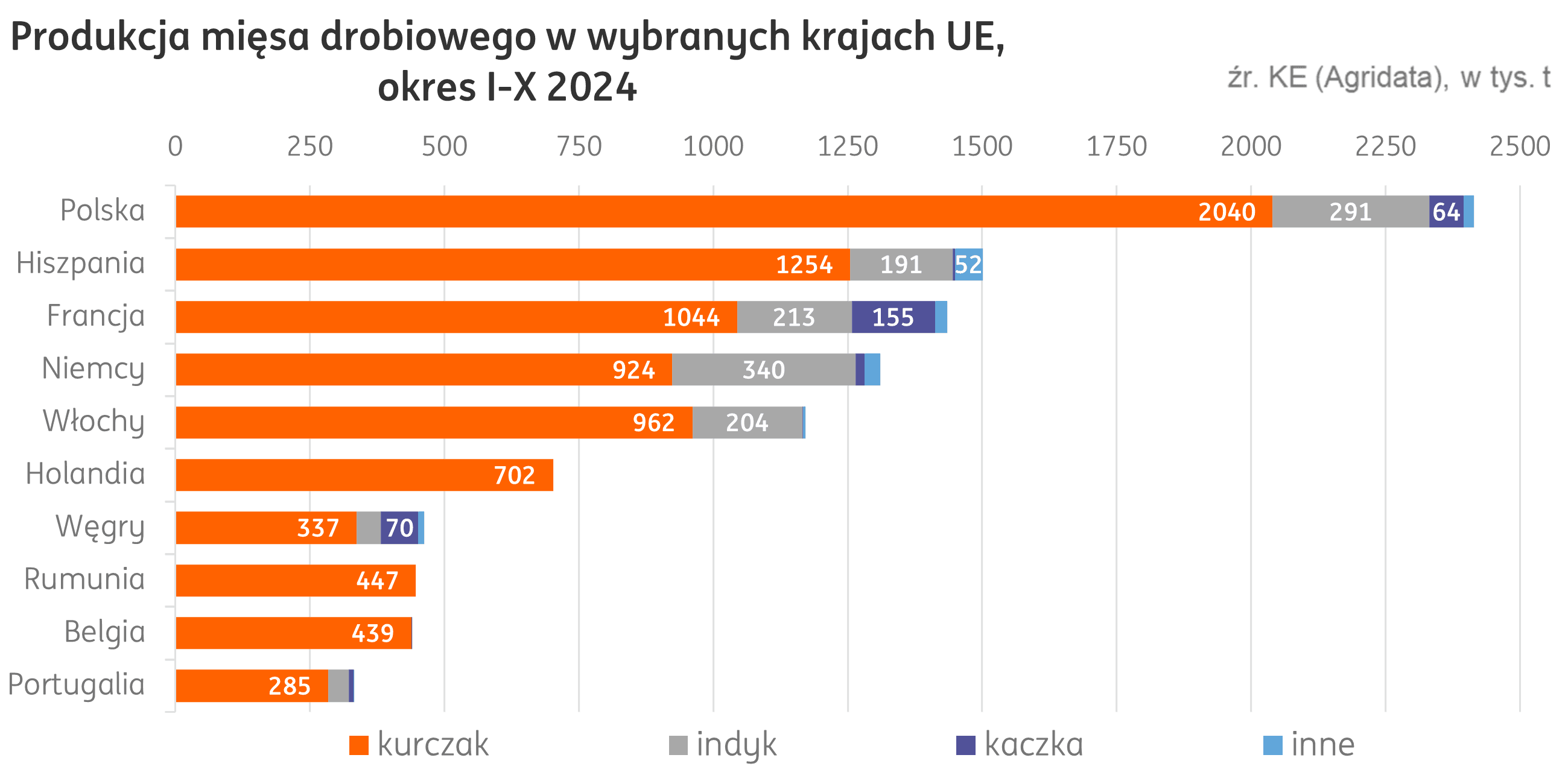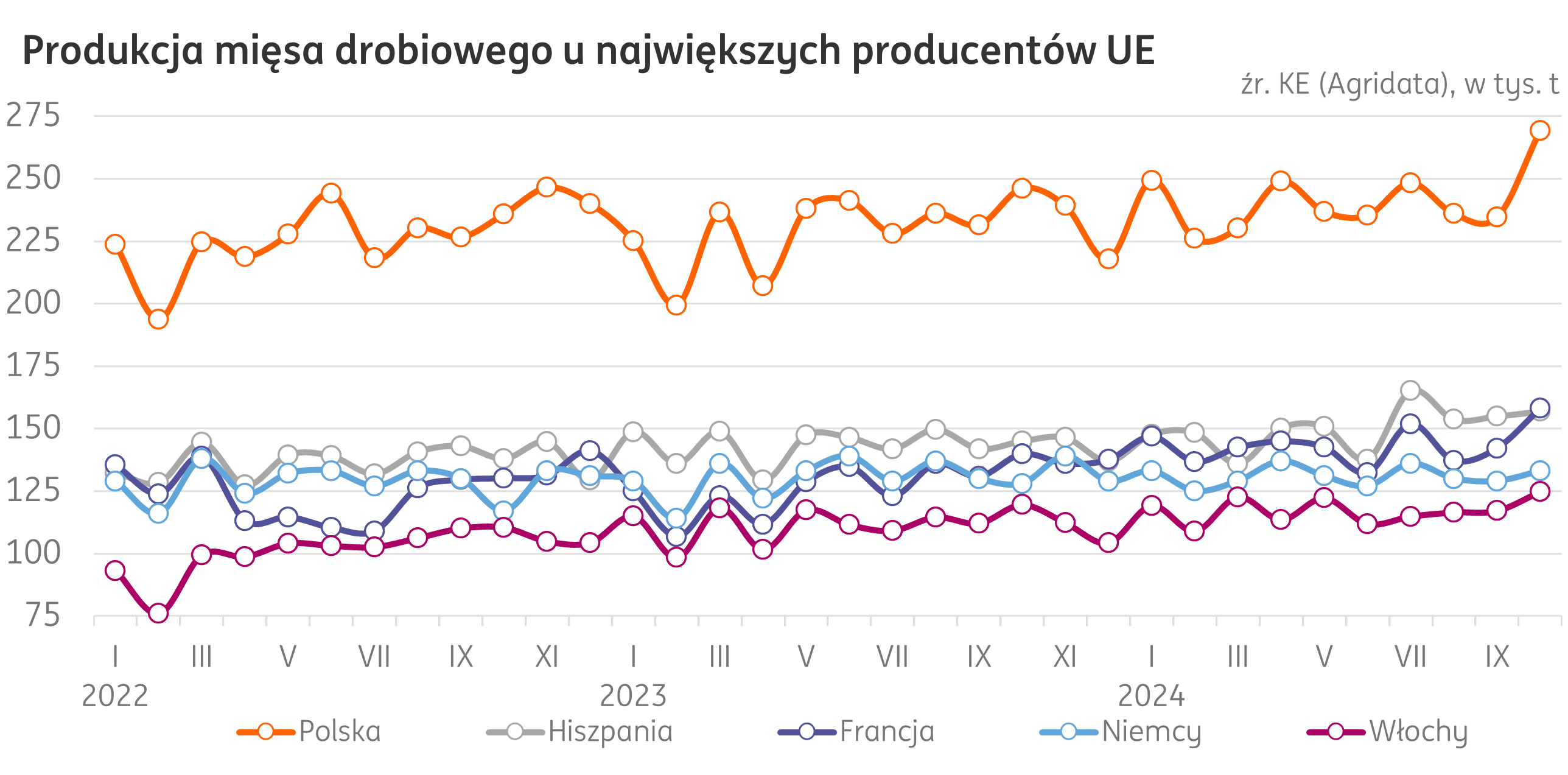 Unia Europejska. W ciągu dziesięciu miesięcy 2024 r. produkcja drobiu w Unii Europejskiej, raportowana przez KE, osiągnęła 11,6 mln t (wg portalu Agridata), o 6% powyżej produkcji ubiegłorocznej. Polska, największy producent drobiu w Europie, wyprodukowała 2,4 mln t (21% produkcji w UE w tym okresie), o 5% więkcej niż rok wcześniej. Hiszpania, drugi kraj UE pod względem wielkości produkcji drobiu, osiągnęła wolumen 1,5 mln t i wzrost o 5% w relacji rocznej. Spory wzrost zanotowano również we Francji, o 14% w porównaniu do ubiegłego roku, przy produkcji 1,4 tys. t.