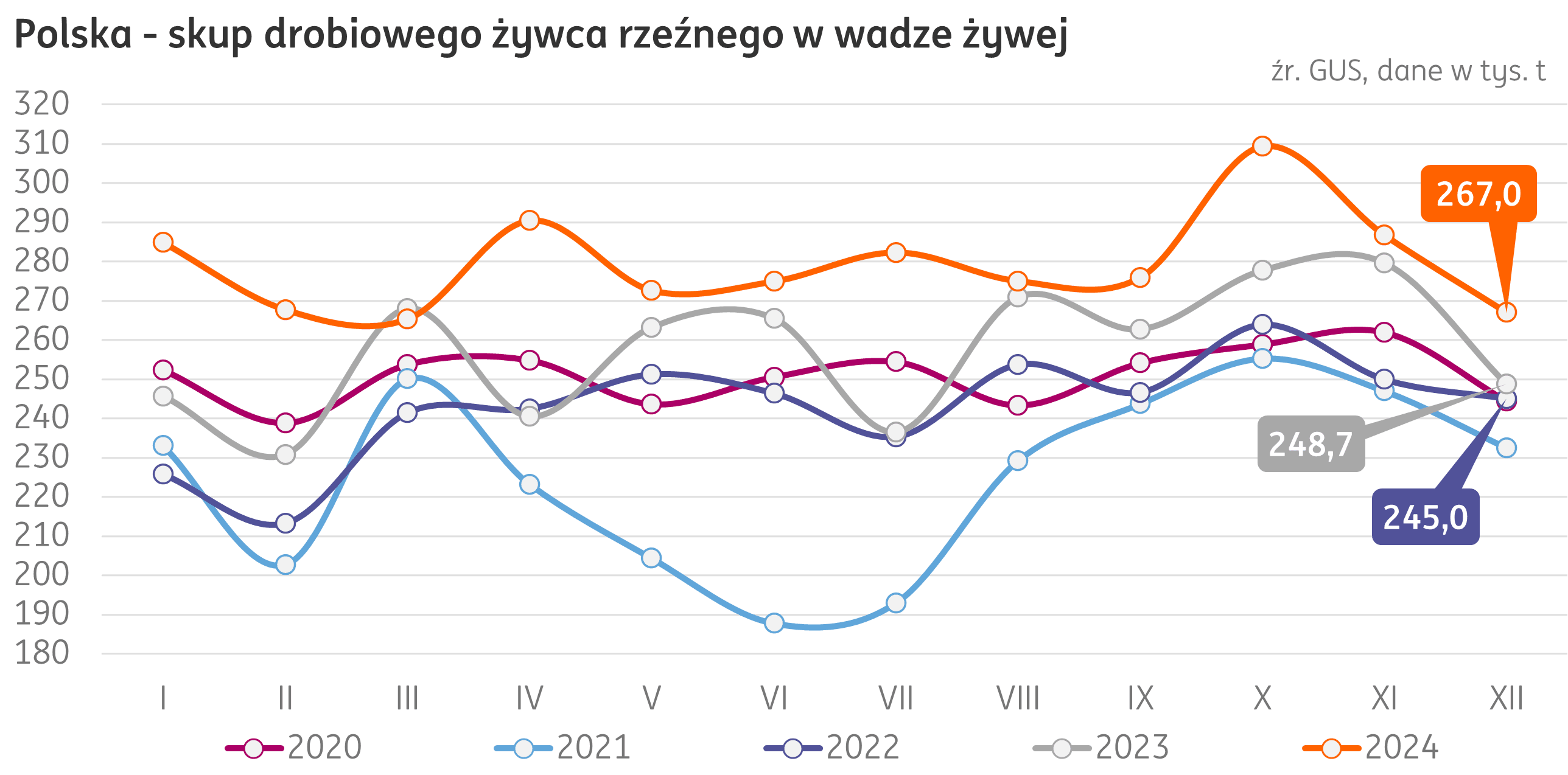 Produkcja. Ostatni miesiąc 2024 r. również zakończył się wzrostem skupu drobiu w ujęciu rocznym, jak niemal wszystkie miesiące ubiegłego roku (poza marcem 2024 r., gdy skup był o 1% r/r niższy). Grudniowy skup osiągnął 267,0 tys. t, o 7% więcej w zestawieniu z grudniem 2023 r. Rok 2024 zakończył się wzrostem skupu o 8% r/r, do 3 557 tys. t (+271 tys. t r/r).
