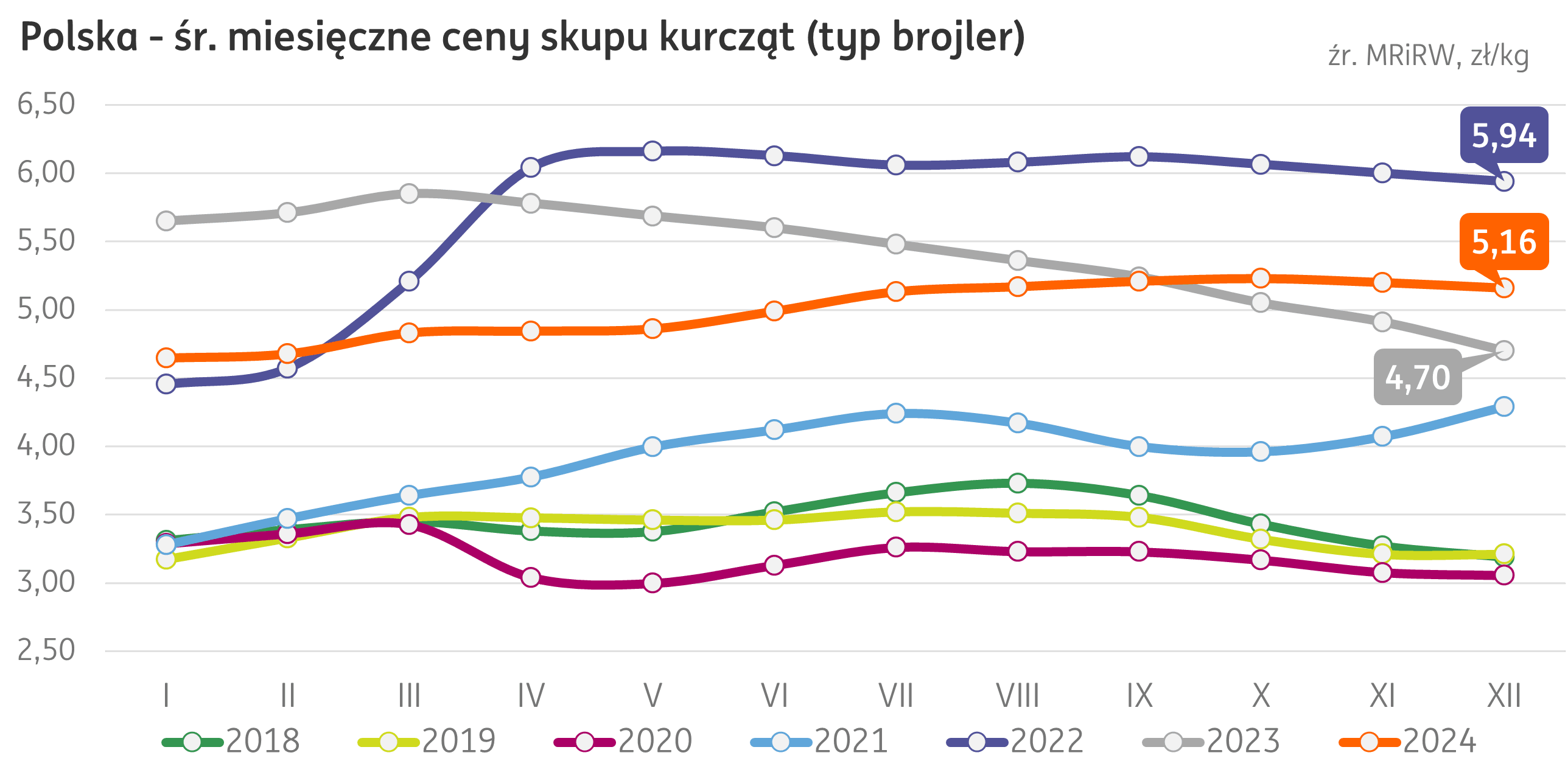 Ceny. Średnia miesięczna cena skupu kurcząt brojlerów (publikacja MRiRW) w grudniu 2024 r. kształtowała się na poziomie 5,16 zł/kg, obniżając się o 0,04 zł/kg w ujęciu miesięcznym. W relacji do grudnia ubiegłego roku, cena jest wyższa o 10%.