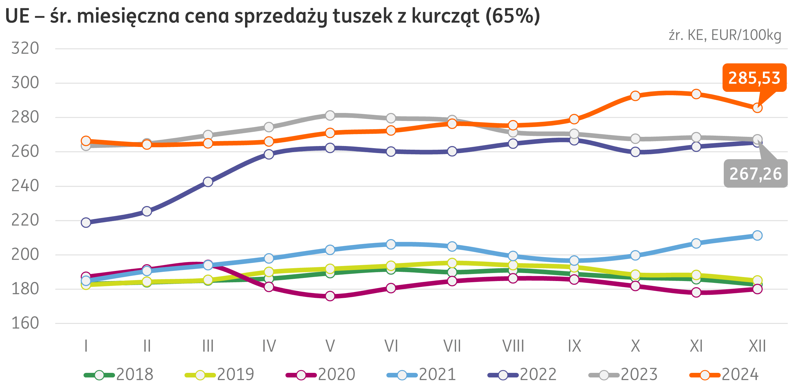 Unia Europejska. W grudniu średnia cena tuszki kurczaka (65%) w krajach Unii Europejskiej wzrosła do 286 EUR/100kg, co oznacza miesięczny spadek o 2,7%, a w ujęciu rocznym cena jest o 6,8% wyższa.