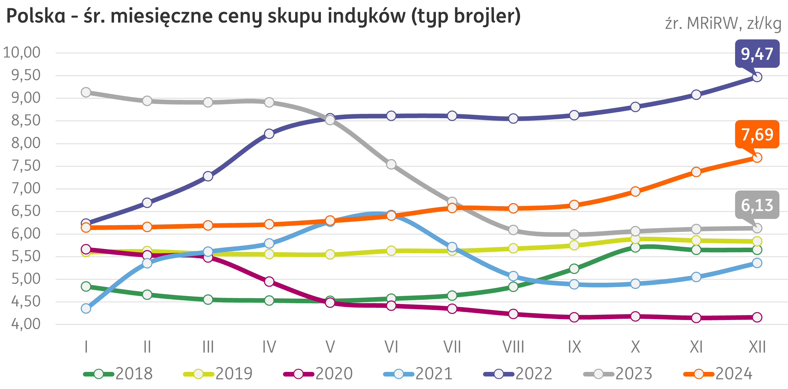 Grudniowa średnia miesięczna cena skupu indyków w Polsce (publikacja MRiRW) wzrosła do 7,69 zł/kg, o 4% w porównaniu do ubiegłego miesiąca. W zestawieniu z 2023 r., cena w grudniu była o 25% wyższa (+1,56 zł/kg r/r).