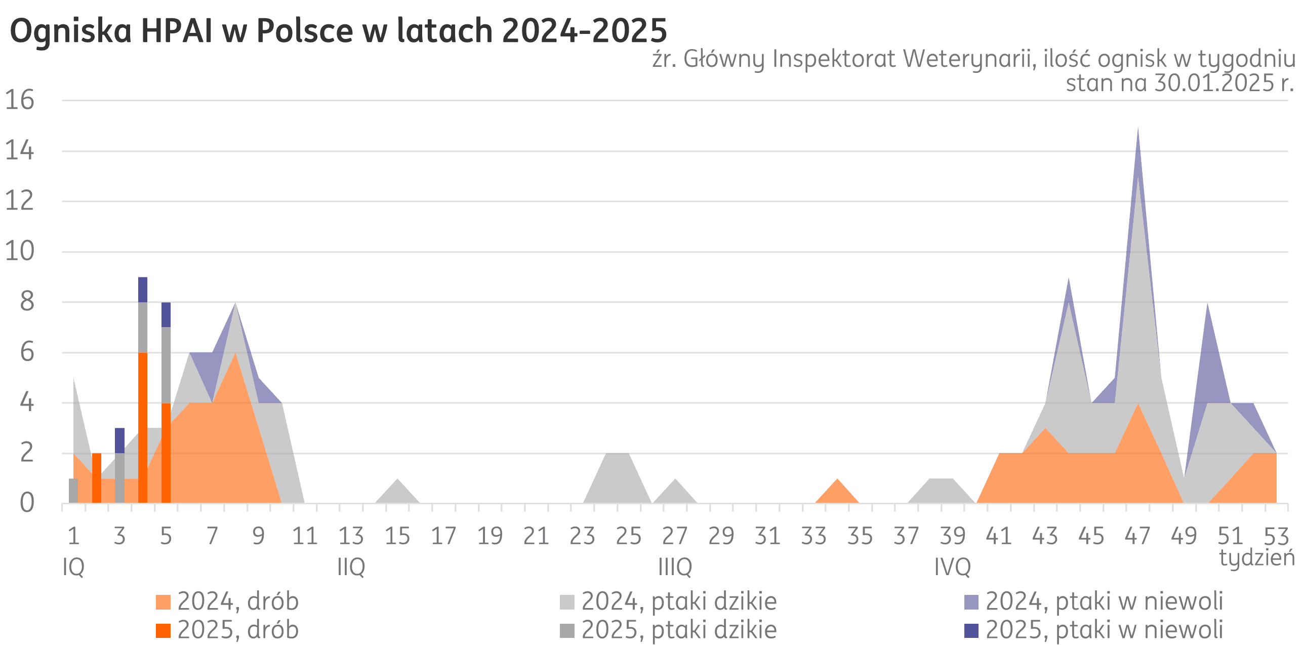 Początek roku nie zatrzymał grypy ptaków (HPAI), w styczniu 2025 r. odnotowano już 23 przypadki tej choroby, w tym 12 u drobiu w chowie komercyjnym. Najczęściej w tym miesiącu ogniska HPAI stwierdzane były wśród indyków rzeźnych (7 ognisk).