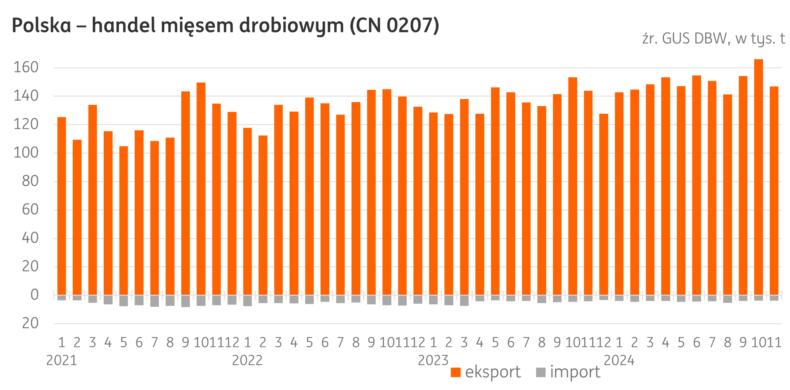 Unia Europejska. Po jedenastu miesiącach 2024 r. eksport mięsa drobiowego poza granice UE wzrósł o 8% r/r, osiągając wolumen 1 835 tys. t. (wg portalu Agridata). Do najliczniej eksportowanej kategorii należało mięso kurze (świeże lub mrożone), jego eksport w analizowanym okresie to 1 323 tys. t (+10% r/r). 38% wyeksportowanego mięsa drobiowego pochodziło z Polski, w analizowanym okresie wolumen eksportu osiągnął 695 tys. t, o 18% więcej niż w ubiegłym roku. Druga, Holandia, wyeksportowała 390 tys. t (21% eksportu drobiu z UE w tym okresie), o 4% mniej w porównaniu do analogicznego okresu ubiegłego roku, a kolejnym krajem pod względem wolumenu jest Francja z eksportem 139 tys. t (+4% r/r) i udziałem 8%. Największym odbiorcą drobiu eksportowanego przez kraje UE była w tym okresie Wielka Brytania, importująca 631 tys. t (+3% r/r).
