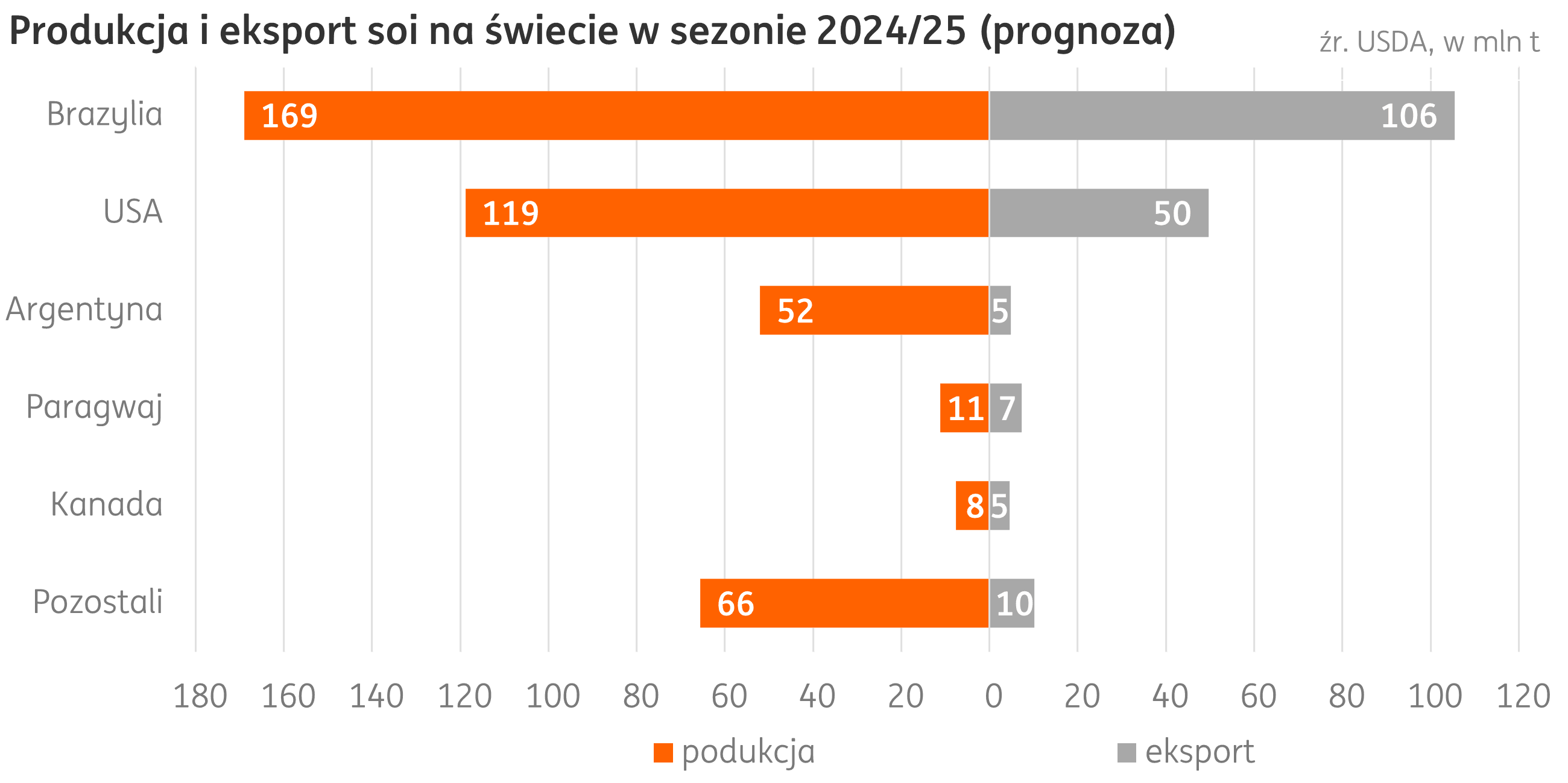 Produkcja soi na świecie. W pierwszym tegorocznym raporcie departamentu Rolnictwa Stanów Zjednoczonych założono, że produkcja soi będzie w sezonie 2024/25 o 2,9 mln t niższa, iż przewidywano w grudniu i osiągnie 424,3 mln t. Produkcja soi w Brazylii pozostaje bez zmian, jej wolumen ma osiągnąć 169 mln t (40% globalnej produkcji), natomiast za zmianę w prognozach odpowiedzialne są USA, których produkcja pomniejszona została o 2,9 mln t w porównaniu do prognoz ubiegłomiesięcznych i aktualnie jest szacowana na poziomie 118,8 mln t (28% globalnej produkcji). Pomimo powyższego, produkcja w bieżącym sezonie o 29,3 mln t ma przewyższyć ubiegłoroczną.