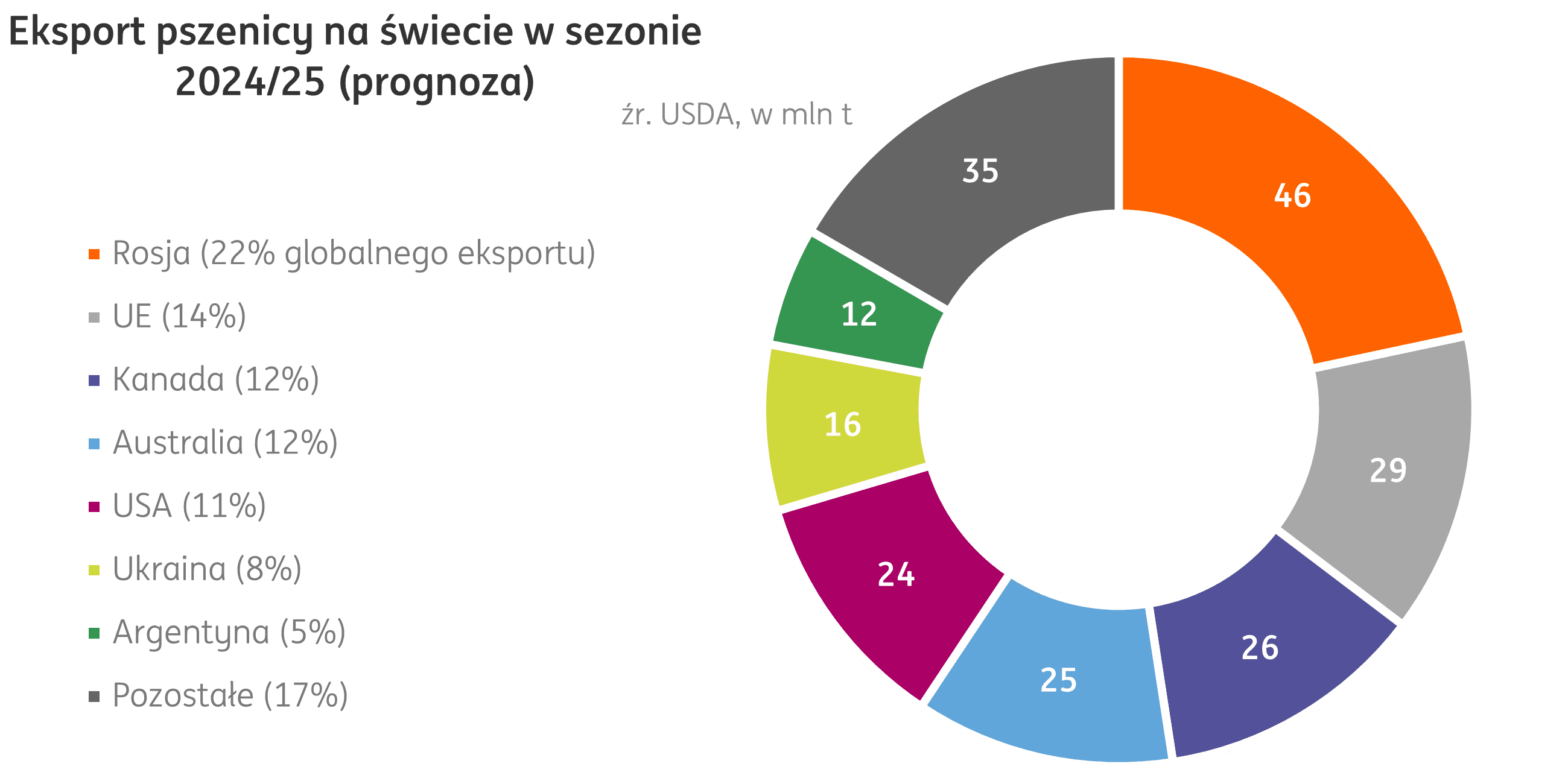 Po upływie ponad połowy sezonu 2024/25 widoczne jest znaczne obniżenie poziomu globalnego handlu pszenicą, a jego wolumen, zgodnie z prognozami USDA ze stycznia 2025 r., ma spaść do 212 mln t, o 5% poniżej poziomu z ubiegłego sezonu (-11 mln t r/r). To najniższy poziom handlu pszenicą od sezonu 2021/22, w którym osiągnięto handel wolumenem 206 mln t. Bieżący sezon ma zakończyć się utrzymaniem pozycji przez największych eksporterów tego zboża, czyli Rosji i Unii Europejskiej, ale przy znacznym obniżeniem eksportowanych wolumenów (Rosji o 17% r/r, UE o 24% r/r) oraz sporym obciążeniem poziomu zapasów z ubiegłego sezonu, bowiem zapasy końcowe pszenicy w Rosji zmniejszą się o 21% r/r, a UE o 32% r/r. Przyczyn jest wiele, jedną z głównych jest niższa produkcja spowodowana niekorzystnymi warunkami agrotechnicznymi, ale także spowolnienie tempa handlu ze względu na niesatysfakcjonujące ceny.