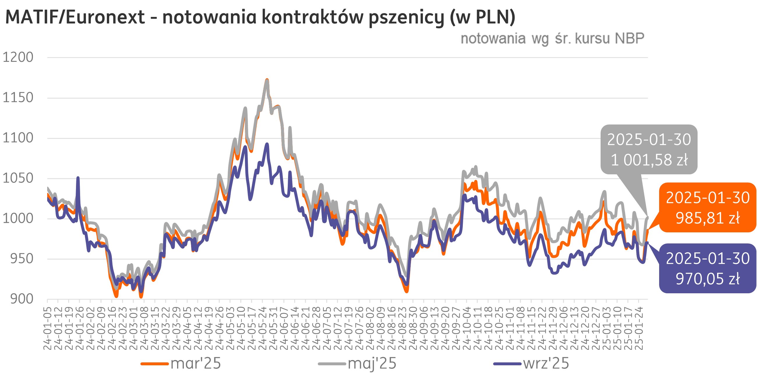 Początek roku to niewielki wzrost notowań najbliższych marcowych kontraktów pszenicy na giełdzie EURONEXT/MATIF, najwyższa cena pszenicy w styczniu na tejże giełdzie to 239,25 EUR/t. Notowania tego kontraktu fluktuowały w ciągu miesiąca, aby pod jego koniec powrócić do cen z analogicznego okresu grudnia ubiegłego roku.