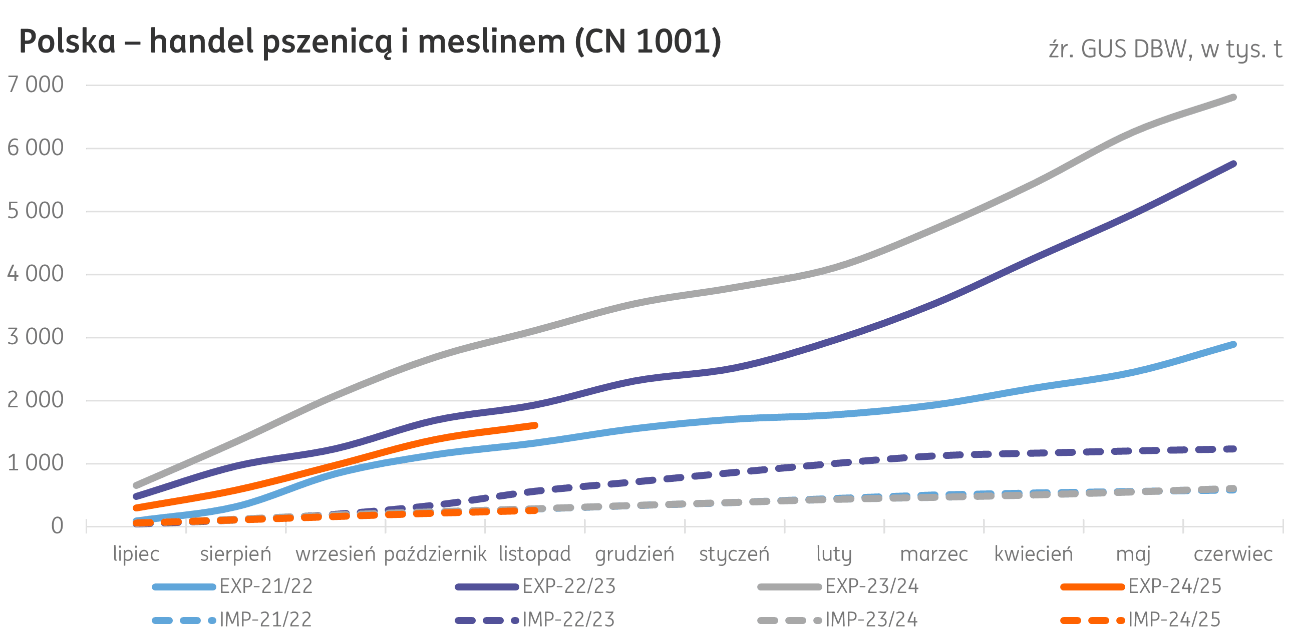 Handel. Po pięciu miesiącach sezonu 2024/25 eksport pszenicy jest obniżony niemal o połowę w porównaniu do ubiegłego sezonu, według danych dostępnych na portalu GUS (Dziedzinowe Bazy Wiedzy), osiągnął on 1 604 tys. t. W listopadzie eksport pszenicy to 225 tys. t, o 47% niżej niż w listopadzie ubiegłego roku. Import od początku sezonu również pozostaje na poziomie niższym do ubiegłorocznego z wolumenem 258 tys. t (-8% r/r), a tylko w listopadzie osiągnął 44 tys. t, o 5% wyżej niż przed rokiem.