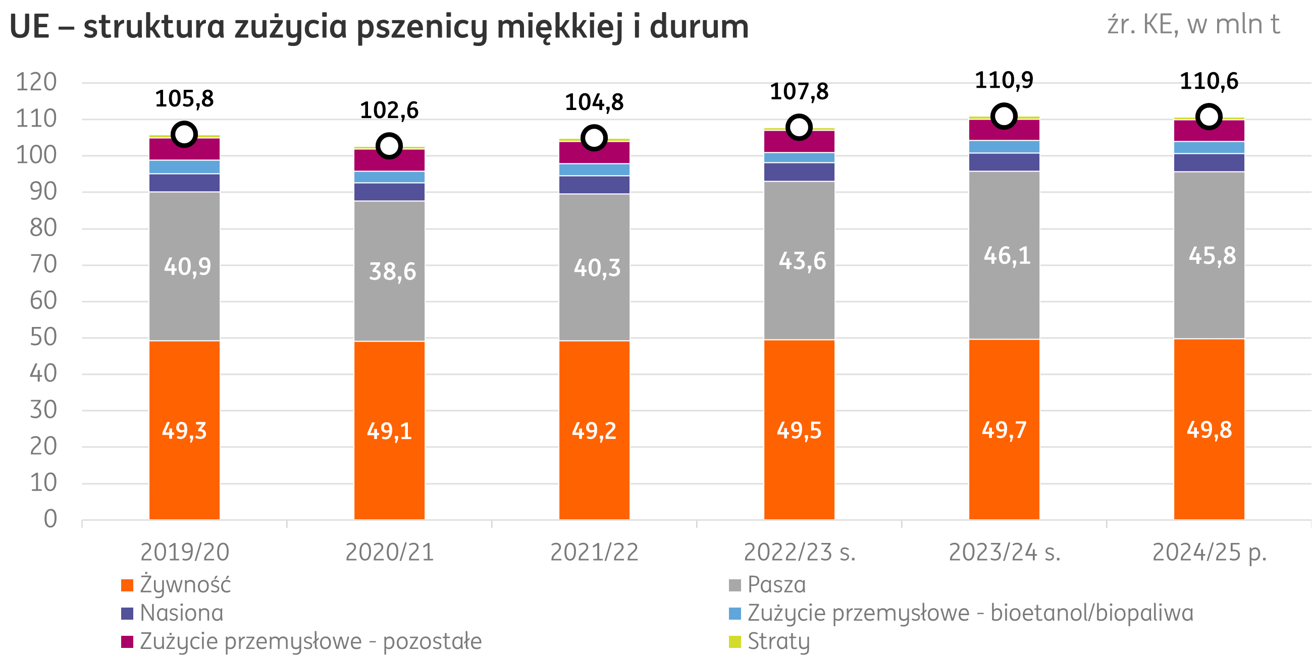 Unia Europejska. Prognozowane w KE zużycie pszenicy w sezonie 2024/25 jest na poziomie 101,6 mln t, to o 0,3 mln t niżej niż przed rokiem. Import spadnie do poziomu 7,0 mln t (-27% r/r), ponadto zapasy końcowe zmniejszą się do 9,4 mln t (-45% r/r). Obniżony zostanie również eksport, prognozy za sezon 2024/25 zakładają, że jego wolumen spadnie do 25,0 mln t (-29% r/r).