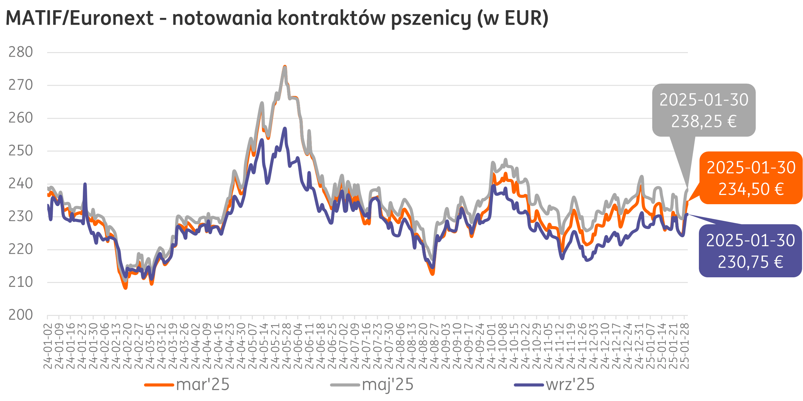 Cena marcowego kontraktu pszenicy 30 stycznia 2025 r. była na zamknięciu na poziomie 234,50 EUR/t, rosnąc zaledwie o 0,25 EUR/t w porównaniu do poprzedniego miesiąca (+0,1% m/m). Kontrakt majowy był notowany na poziomie 238,25 EUR/t (0,5% m/m), natomiast wrześniowy na poziomie 230,75 EUR/t (+2,0% m/m).