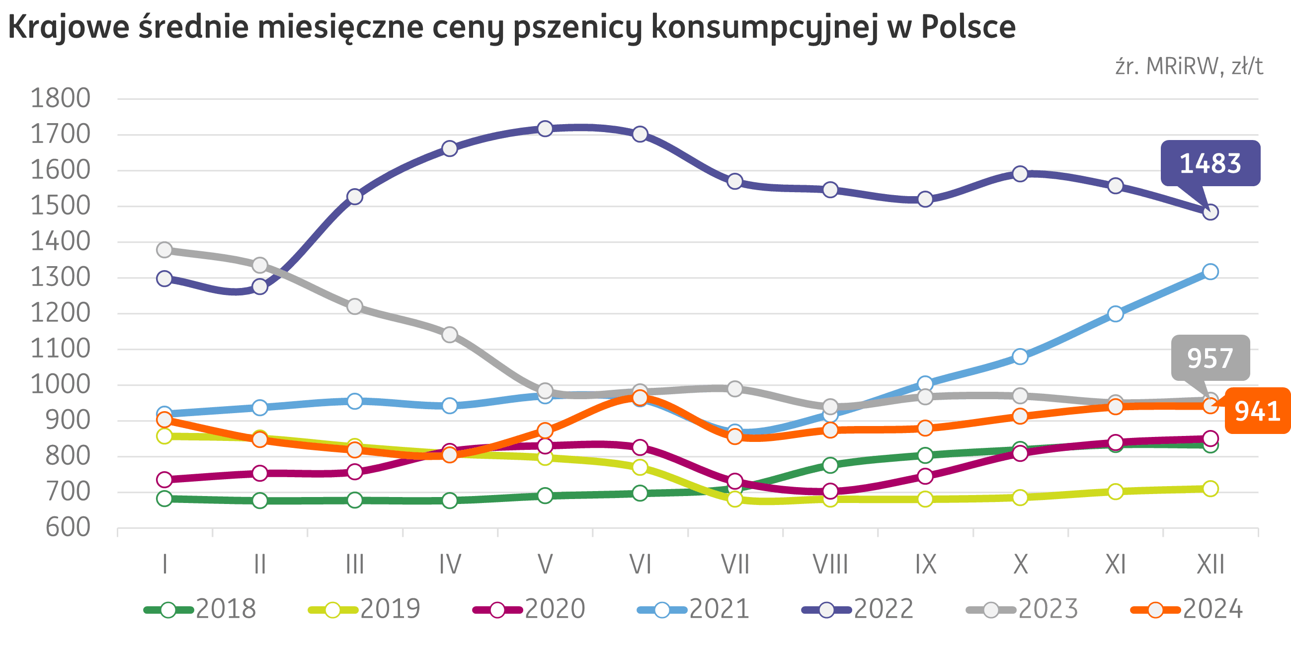 Cena. W grudniu cena pszenicy konsumpcyjnej w Polsce zaliczyła niewielki wzrost o 0,3% m/m i kształtowała się na średnim poziomie 941 zł/t (+2 zł/t m/m; dane wg biuletynu MRIRW). W porównaniu do grudnia ubiegłego roku, cena jest niższa o 16 zł/t (-2% r/r). Na rynku krajowym 26 stycznia 2025 r. średnie ceny pszenicy konsumpcyjnej kształtowały się w przedziale 842-993 zł/t.