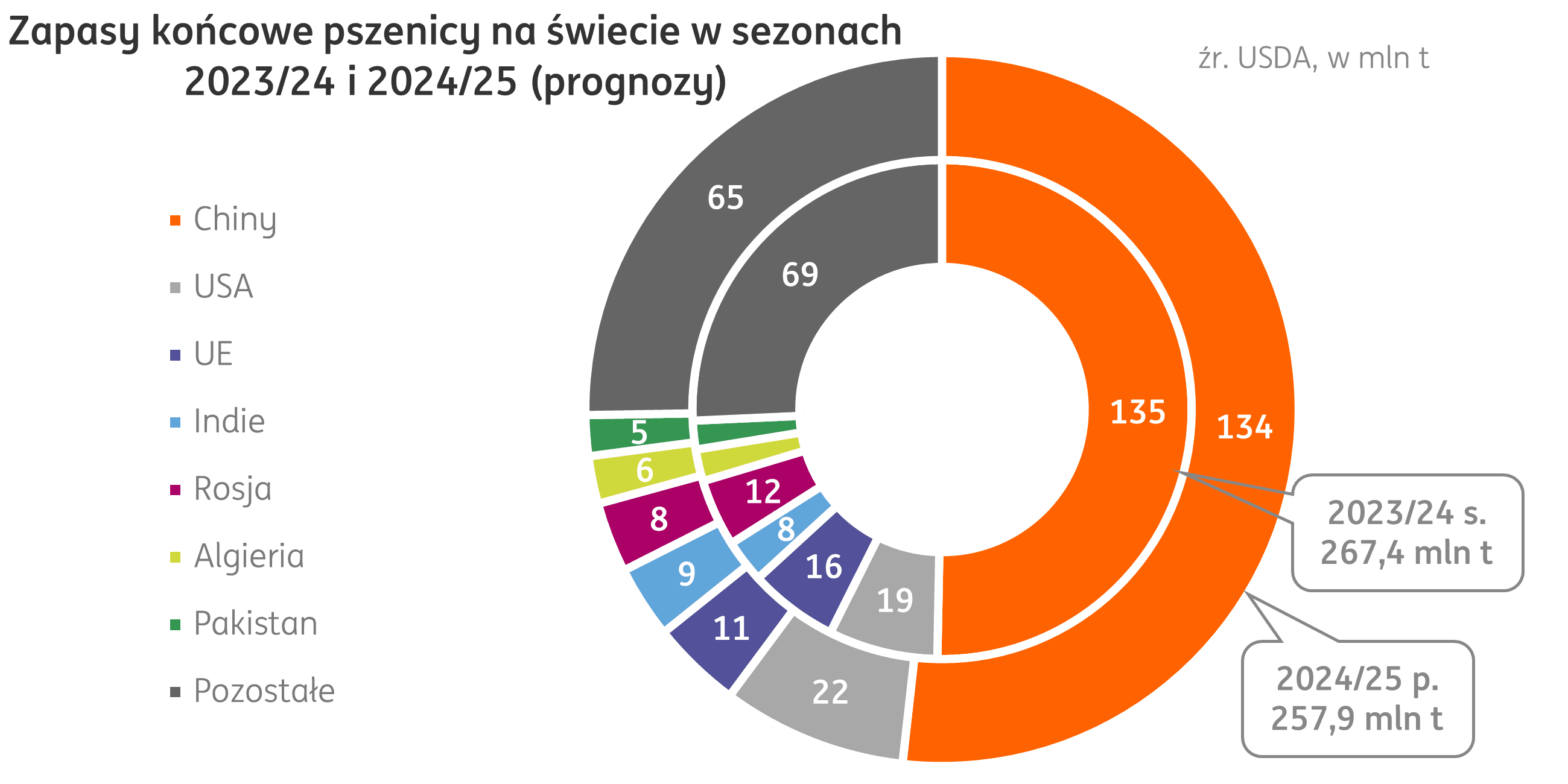 Świat. W styczniu zapasy końcowe pszenicy w sezonie 2024/25 są prognozowane przez USDA na poziomie 258,8 mln t, to o 8,7 mln t (-3% r/r) mniej w porównaniu do ubiegłego sezonu. Ponad połowa ma znajdować się w Chinach, których zapasy mają pozostać na poziomie 133,1 mln t, o 1,4 mln t poniżej zapasów z ubiegłego sezonu. Krajem gromadzącym drugie pod względem wolumenu zapasy pszenicy mają być USA z 21,7 mln t, co stanowi 8% ich globalnego poziomu (+15% r/r), na trzecim miejscu są kraje UE z udziałem 4% i wolumenem 10,6 mln t (-32% r/r).
