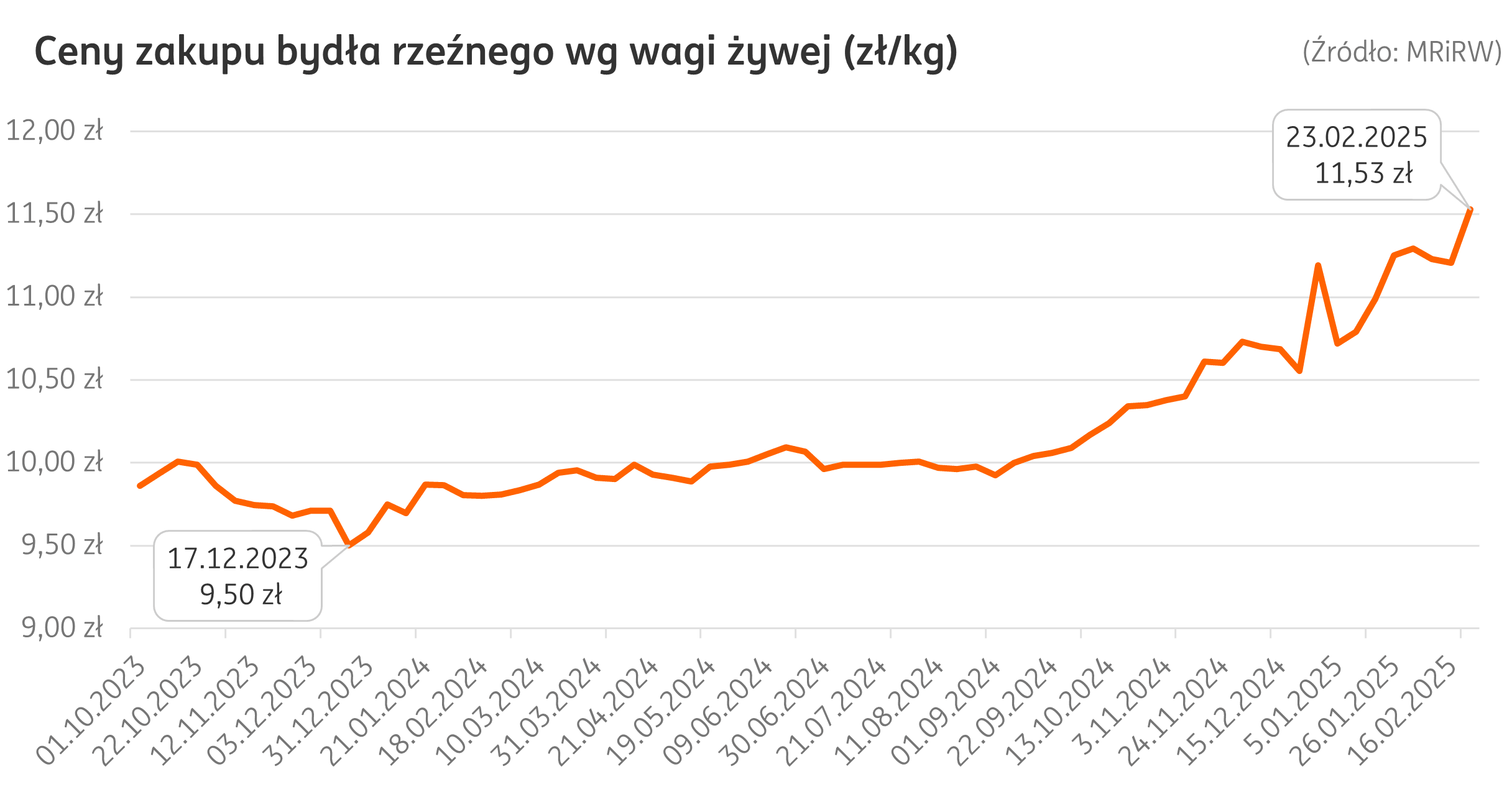 W Polsce trwa trend wzrostowy. Od trzeciego kwartału 2024 r. na rynku bydła mięsnego obserwowana jest fala wznosząca, a stawki za żywiec przekroczyły pod koniec lutego pułap 11,50 zł/kg. Podobna tendencja dominuje w pozostałych krajach Unii Europejskiej. W Niemczech z uwagi na duże zapotrzebowanie przetwórców i ograniczoną podaż surowca.