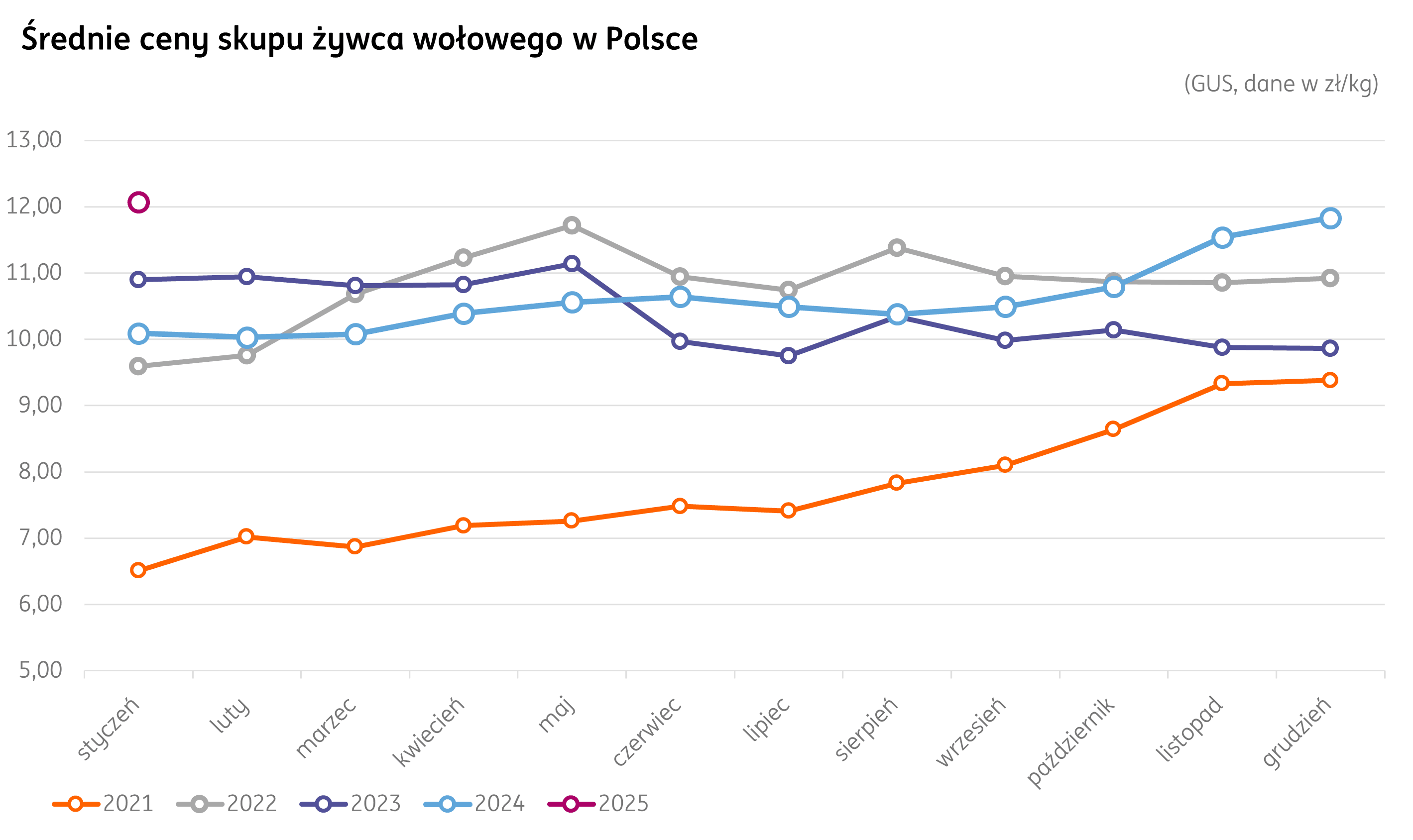 W styczniu 2025 r. średnie stawki za bydło mięsne kolejny miesiąc z rzędu odnotowały wzrost. Cena 12,07 zł/kg jest 24 gr wyższa niż w grudniu. W stosunku do zeszłego roku bieżący poziom jest wyższy o 20%.