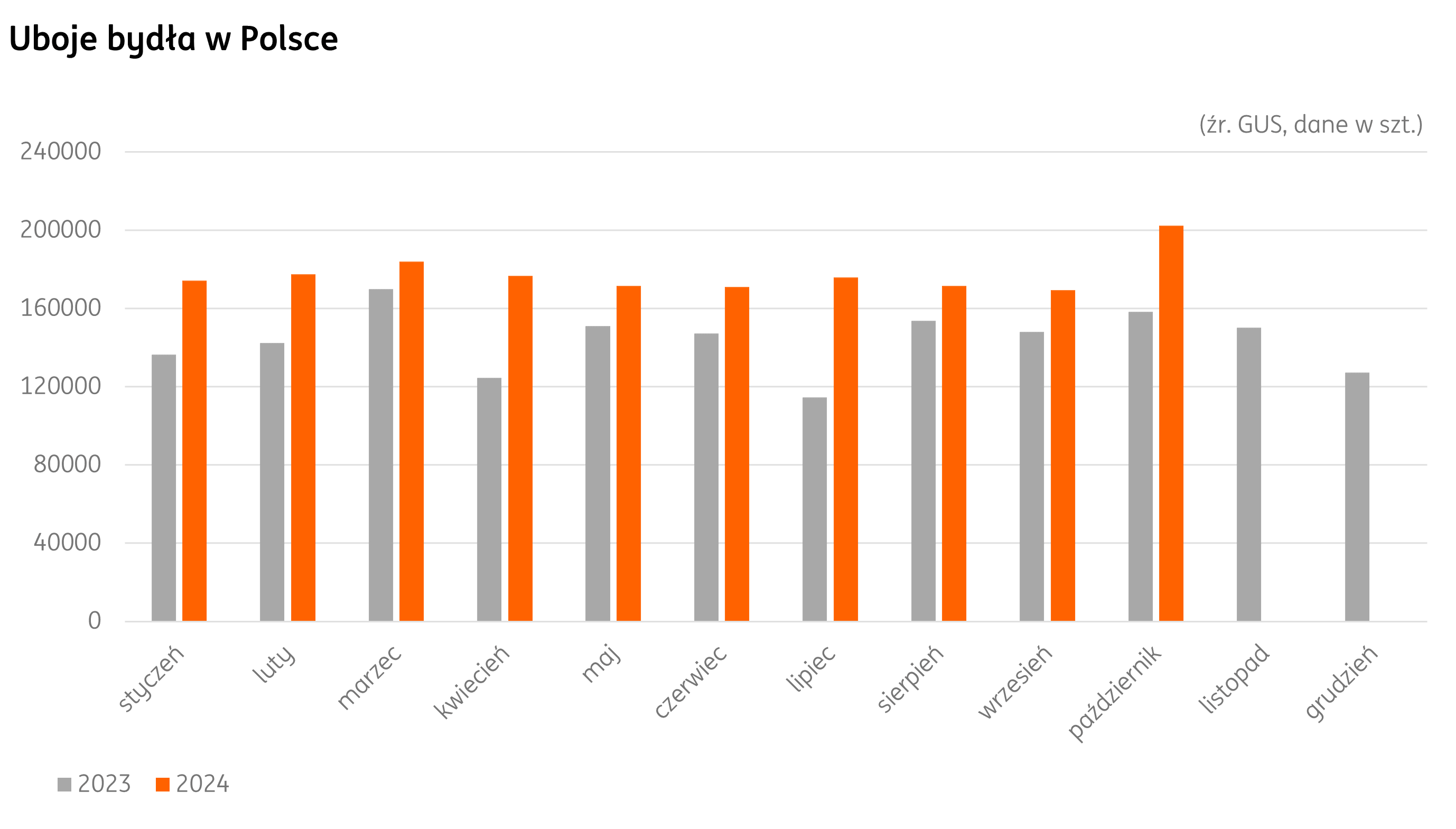 Uboje w Polsce: 2024 rok pod względem wolumen ubojów utrzymuje mocne przyśpieszenie. Według wstępnych danych MRiRW wartość w pierwszych dziesięciu miesiącach 2024 r. przekroczyła poziom 1 774 tys. szt. W stosunku do 2023 r. to wzrost aż o niemal 23%.