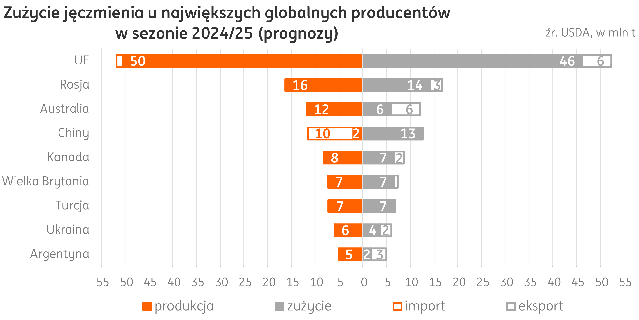Unia Europejska. Zgodnie z lutowymi raportami Komisji Europejskiej, produkcja jęczmienia w krajach UE osiągnęła w 2024 r. 49,8 mln t, o 2,1 mln t więcej niż rok wcześniej. Największą wolumenowo produkcję tego zboża osiągnięto w Niemczech (21% produkcji UE), ubiegłoroczne zbiory są tam szacowane na 10,6 mln t (-4% r/r). Produkcja we Francji spadła do 9,9 mln t (-20% r/r) wskutek niekorzystnych warunków agrotechnicznych. Zbiory na poziomie 3,0 mln t (+4% r/r) plasują Polskę na piątym miejscu ze względu na wolumen produkcji pośród krajów UE.